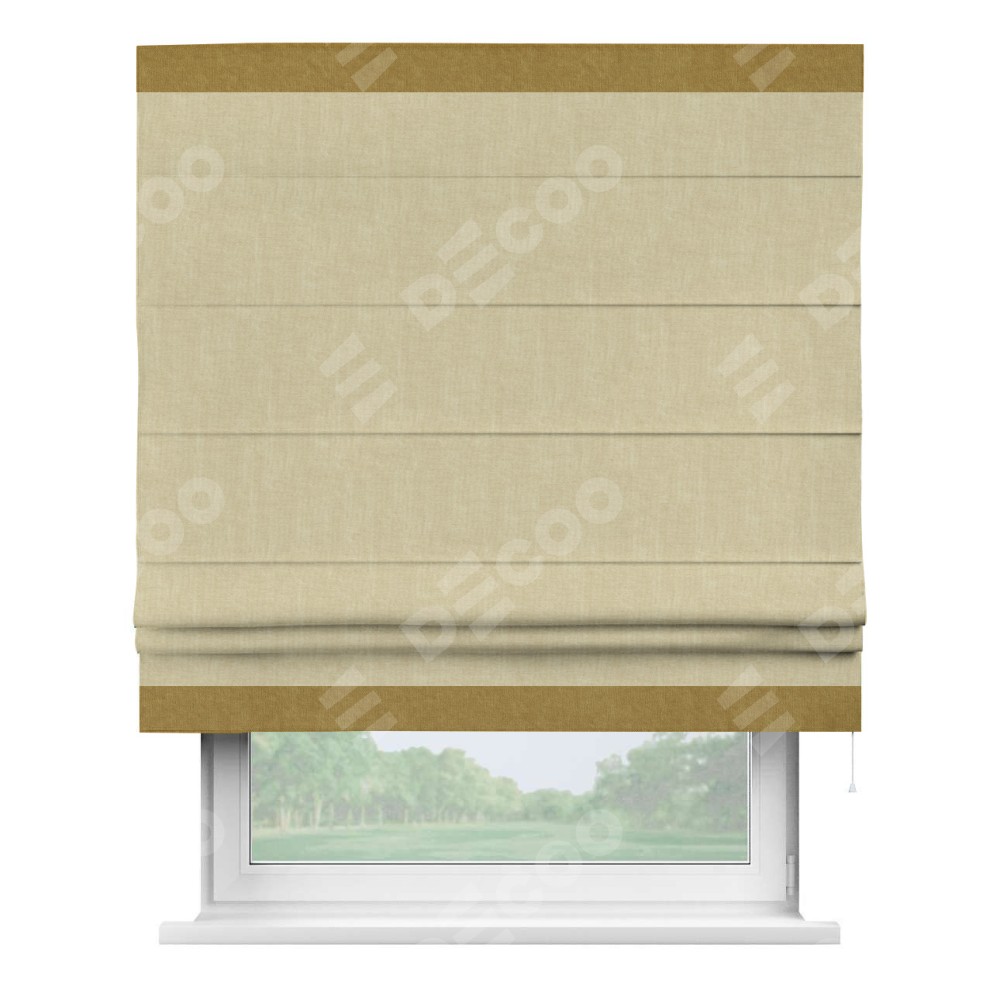 Римская штора производителя «Cortin», используется для проёма, пошита из ткани канвас тёмно-бежевый, артикул ткани v-196. Отделка шторы кантом «Горизонт» (горчица v-476), ткань для канта используется из канваса разной расцветки на выбор. Имеет универсальный механизм и подходит для монтажа: на потолок, на стену и в нишу.