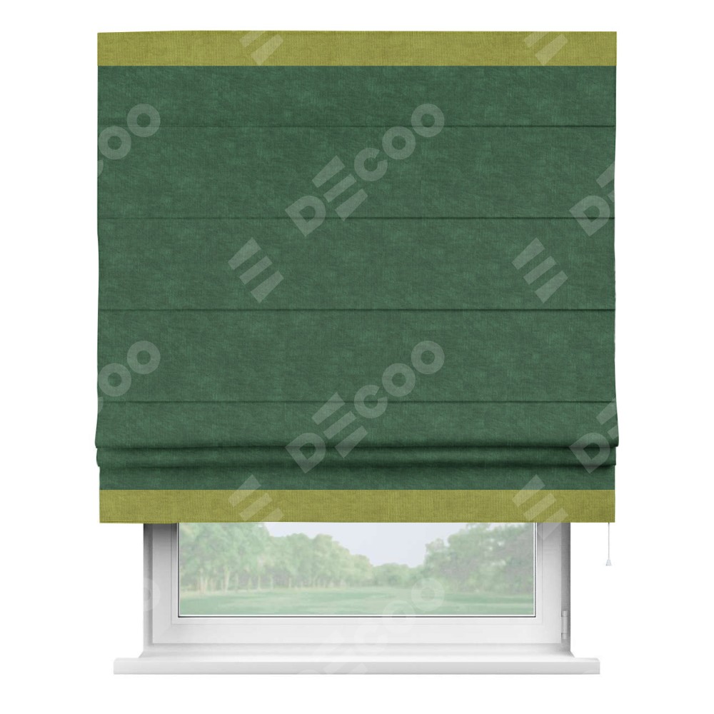 Римская штора производителя «Cortin», используется для проёма, пошита из ткани канвас тёмно-зелёный, артикул ткани v-469. Отделка шторы кантом «Горизонт» (зелёное яблоко v-370), ткань для канта используется из канваса разной расцветки на выбор. Имеет универсальный механизм и подходит для монтажа: на потолок, на стену и в нишу.