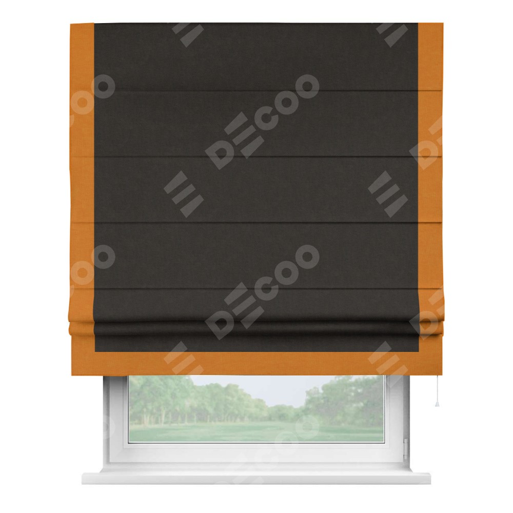 Римская штора производителя «Cortin», используется для проёма, пошита из ткани канвас тёмно-коричневый, артикул ткани v-13. Отделка шторы кантом «Виктория» (оранжевый v-106), ткань для канта используется из канваса разной расцветки на выбор. Имеет универсальный механизм и подходит для монтажа: на потолок, на стену и в нишу.