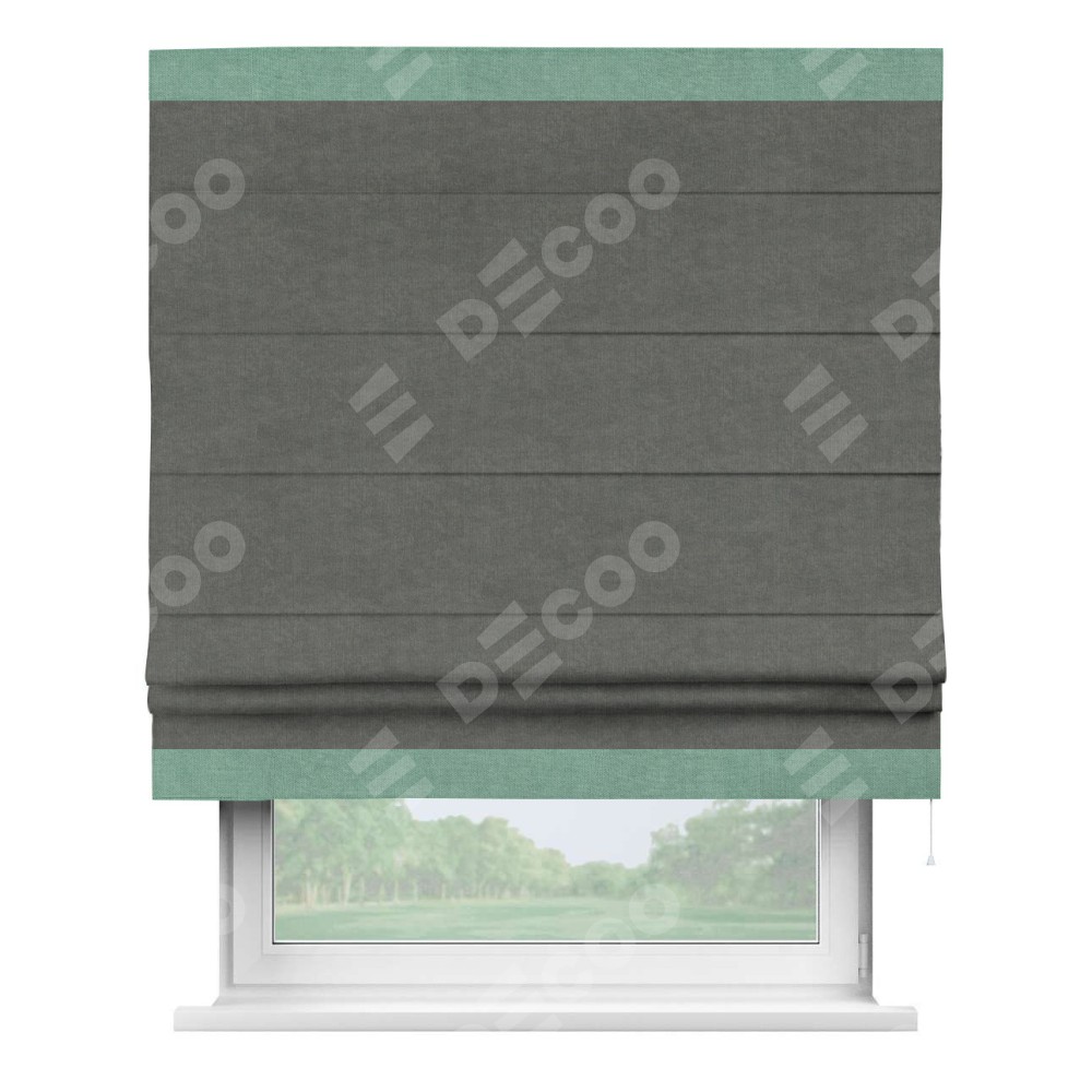 Римская штора производителя «Cortin», используется для проёма, пошита из ткани канвас тёмно-серый, артикул ткани v-340. Отделка шторы кантом «Горизонт» (мятный v-248), ткань для канта используется из канваса разной расцветки на выбор. Имеет универсальный механизм и подходит для монтажа: на потолок, на стену и в нишу.