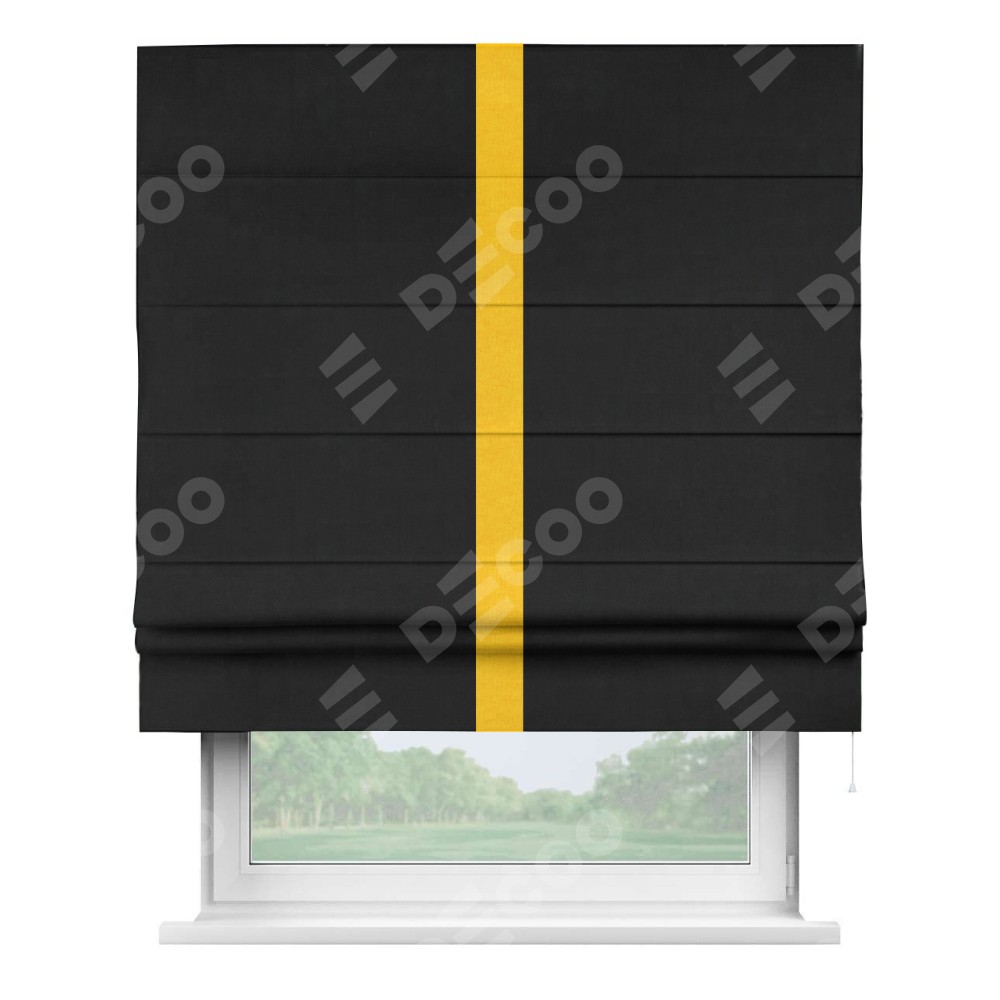 Римская штора производителя «Cortin», используется для проёма, пошита из ткани канвас черный, артикул ткани v-194. Отделка шторы кантом «Хайвей» (желтый v-344), ткань для канта используется из канваса разной расцветки на выбор. Имеет универсальный механизм и подходит для монтажа: на потолок, на стену и в нишу.