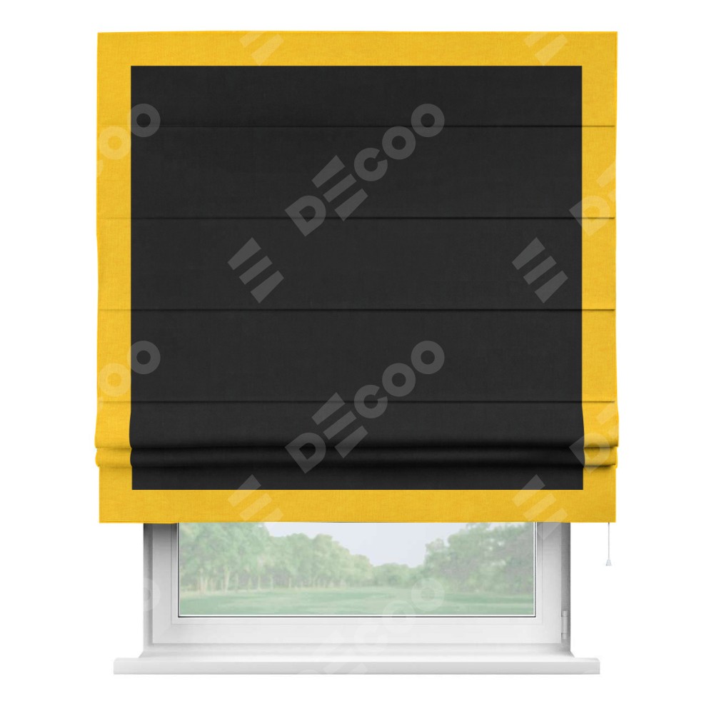 Римская штора производителя «Cortin», используется для проёма, пошита из ткани канвас черный, артикул ткани v-194. Отделка шторы кантом «Чесс» (желтый v-344), ткань для канта используется из канваса разной расцветки на выбор. Имеет универсальный механизм и подходит для монтажа: на потолок, на стену и в нишу.