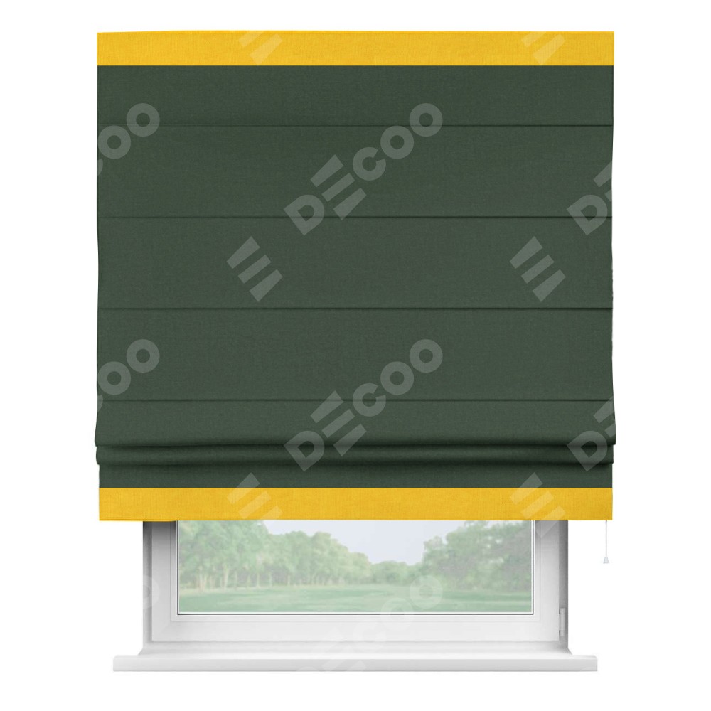 Римская штора производителя «Cortin», используется для проёма, пошита из ткани канвас глубокий зелёный, артикул ткани v-588. Отделка шторы кантом «Горизонт» (желтый v-344), ткань для канта используется из канваса разной расцветки на выбор. Имеет универсальный механизм и подходит для монтажа: на потолок, на стену и в нишу.