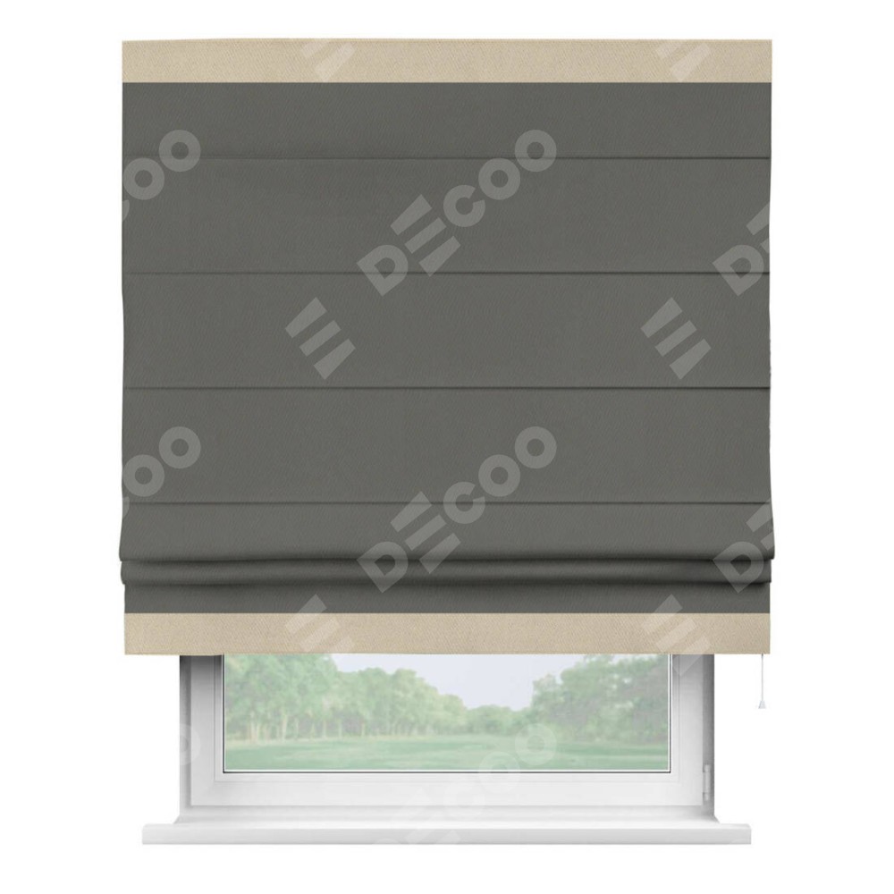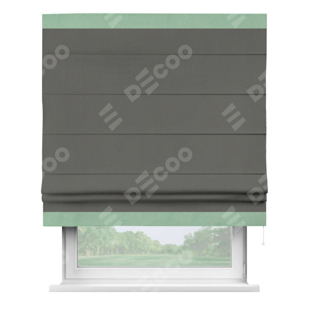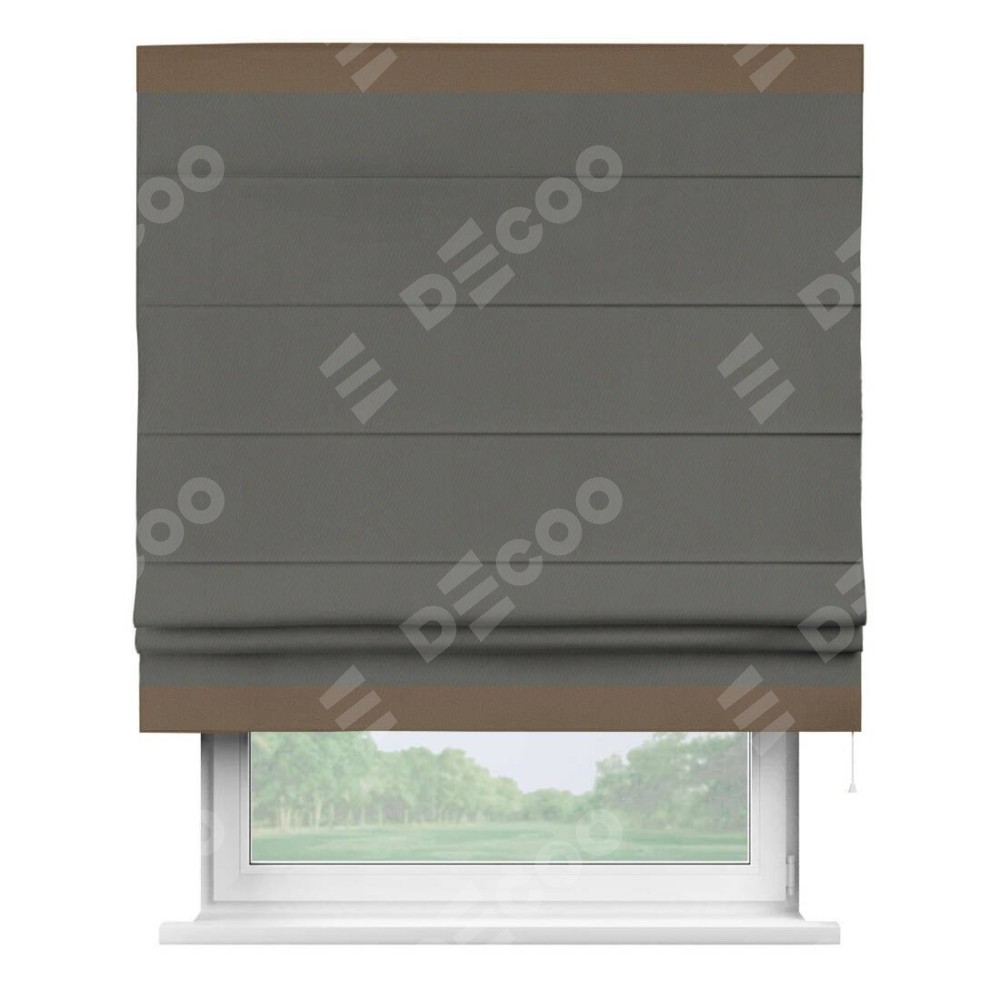 Римская штора производителя «Cortin», используется для проёма, пошита из ткани блэкаут однотонный тёмно-серый, артикул ткани 91570. Отделка шторы кантом «Горизонт», ткань для канта используется из блэкаута однотонного разной расцветки на выбор. Имеет универсальный механизм и подходит для монтажа: на потолок, на стену и в нишу.
