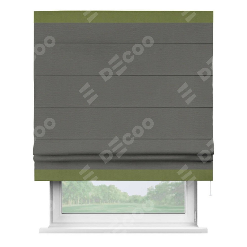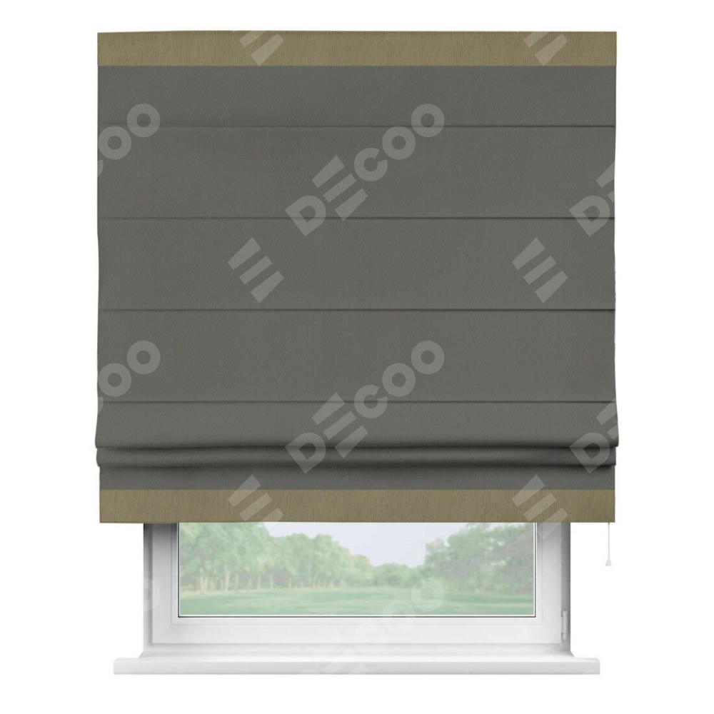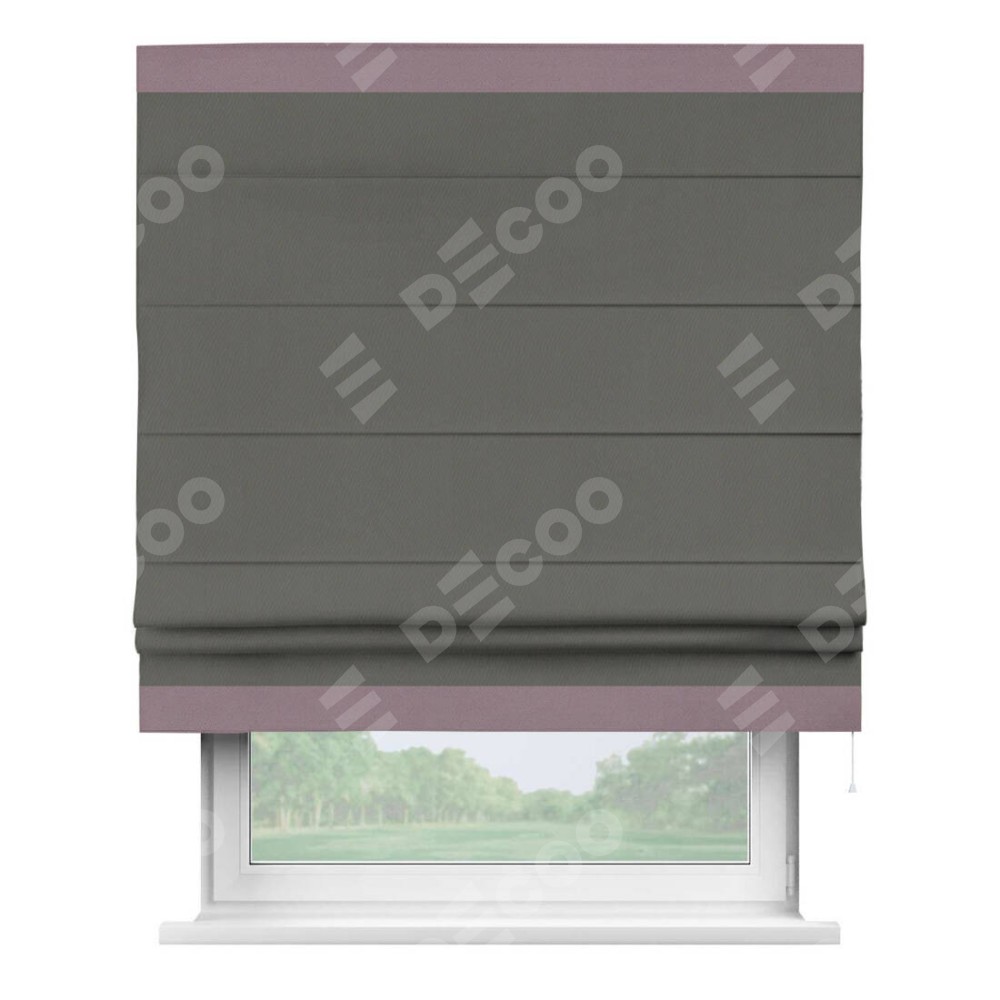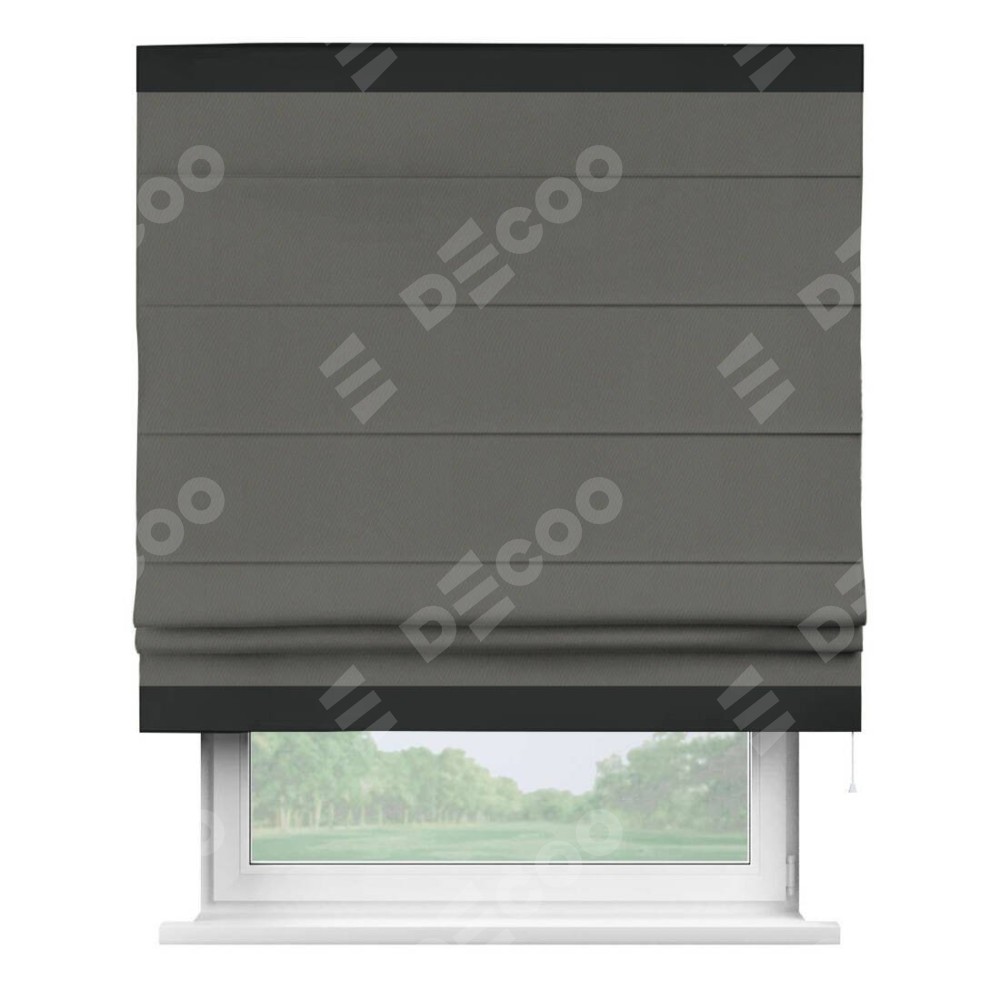 Римская штора производителя «Cortin», используется для проёма, пошита из ткани блэкаут однотонный тёмно-серый, артикул ткани 91570. Отделка шторы кантом «Горизонт», ткань для канта используется из блэкаута однотонного разной расцветки на выбор. Имеет универсальный механизм и подходит для монтажа: на потолок, на стену и в нишу.