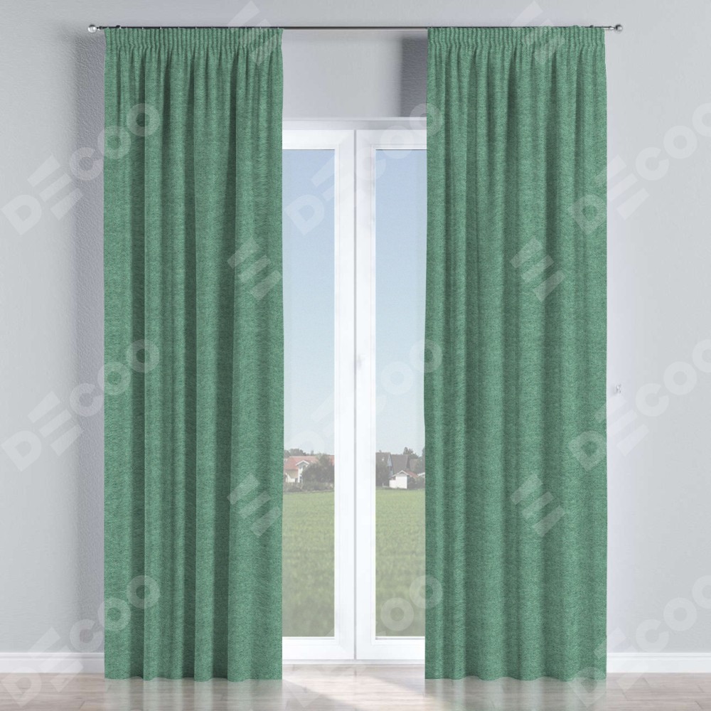 Комплект прямых штор, от производителя «Cortin», пошиты из ткани твид блэкаут бирюзовый, артикул ткани 90934. С изнаночной стороны в верхней части штор пристрачивается шторная лента с декоративными складками «Карандаш». Для создания элегантных складок прямые шторы шьются по стандарту с коэффициентом 1:2 (на 100 см. ширины проёма 200 см. ширины ткани).