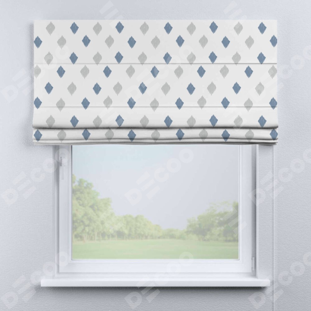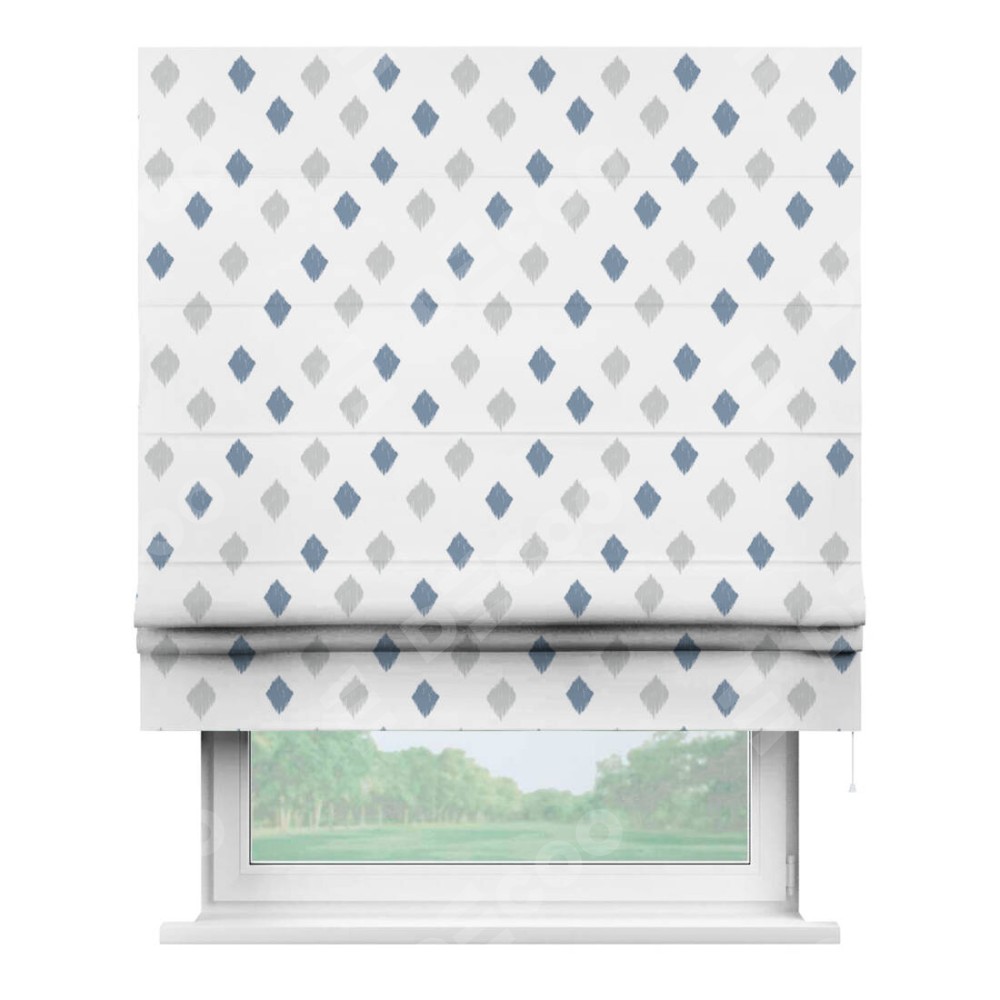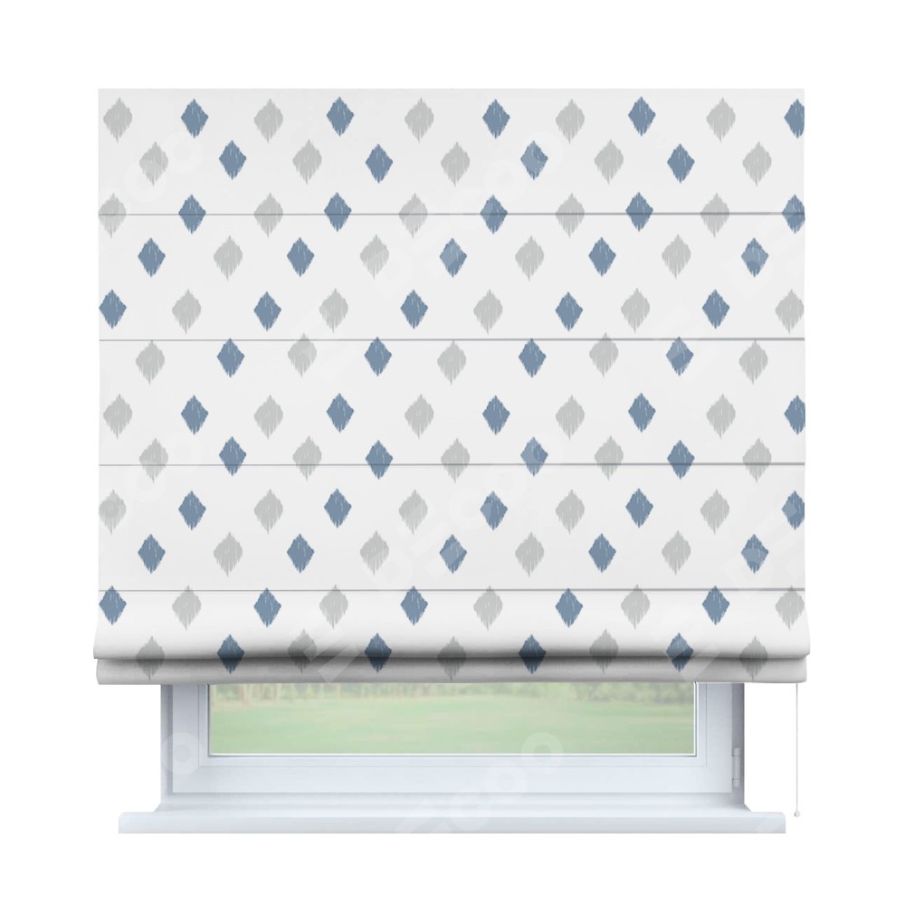 Классическая римская штора производителя «Cortin», пошита из ткани блэкаут с нанесением сублимационной печати «Икат ромбики». Имеет универсальный механизм и подходит для монтажа: на потолок, на стену и в нишу.