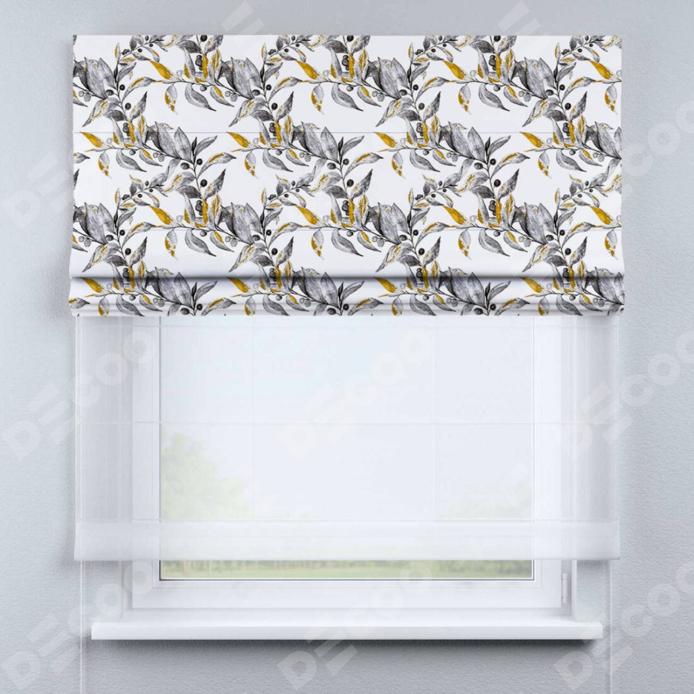 Двойная римская штора «День-ночь» от производителя Cortin предназначена для использования в проёмах. Эта штора уникальна тем, что состоит из двух полотен. На лицевой стороне находится блэкаут с нанесением сублимационной печати «Оливковое дерево», обеспечивающий эффективное затемнение. В комплект также входит вторая ткань — легкий белый тюль (артикул: V-01), который добавляет изящества и легкости оформлению окна. Кроме того, доступны и другие разновидности ткани тюль, выбор которых доступен по  ссылке .