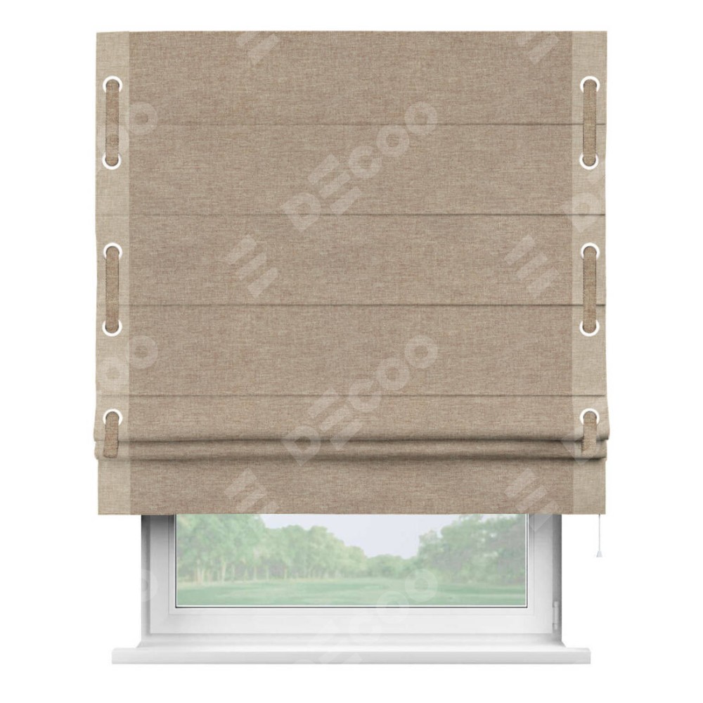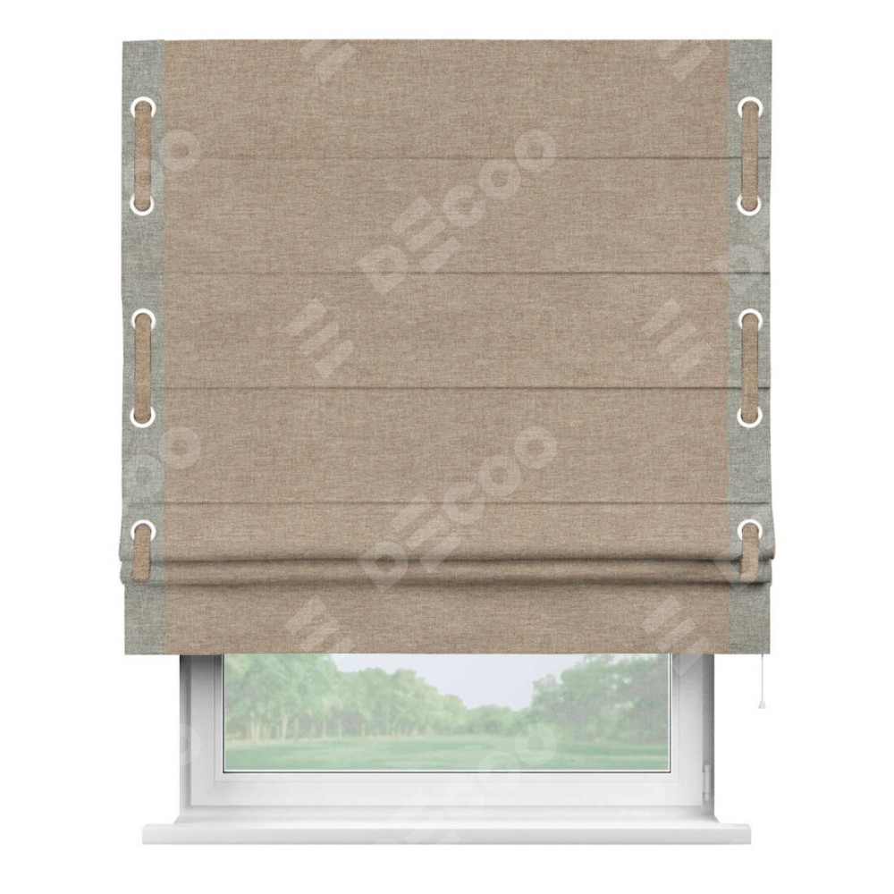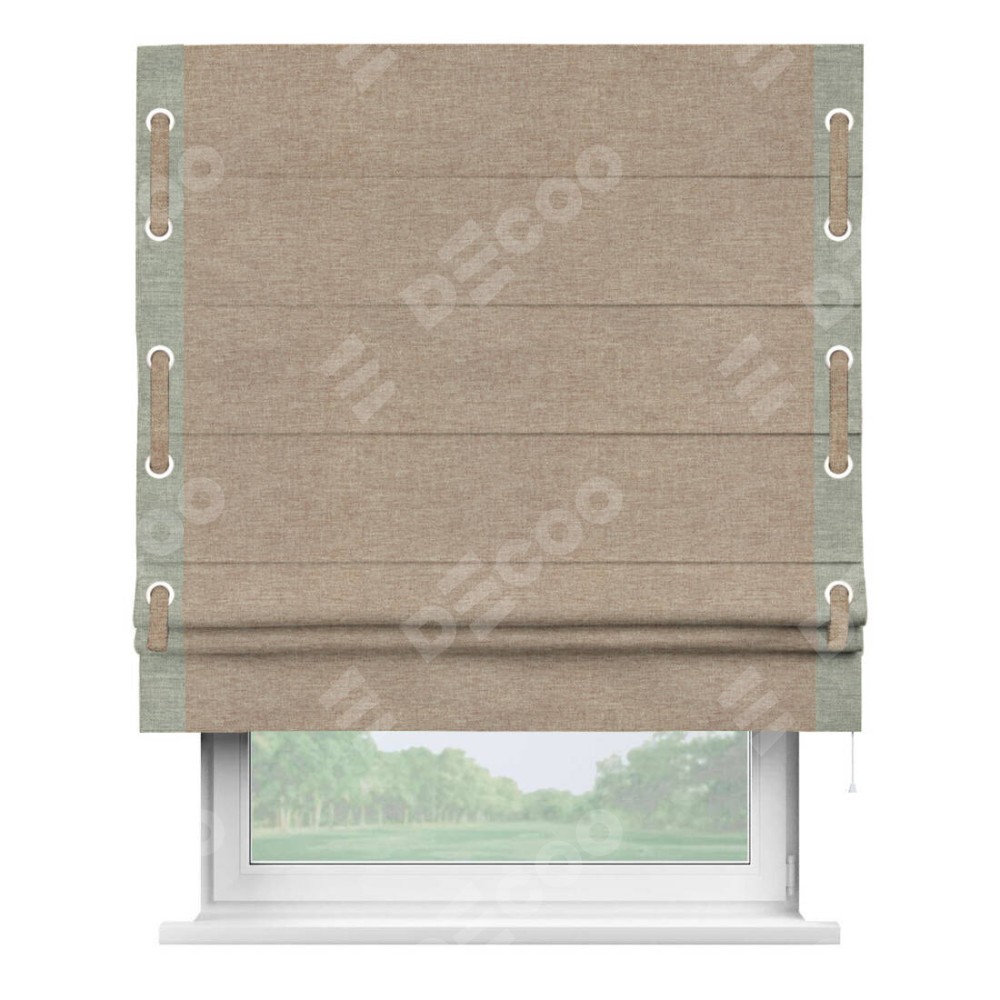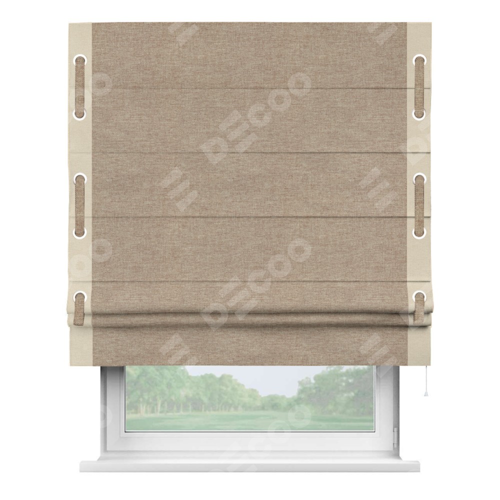 Римская штора производителя «Cortin», используется для проёма, пошита из ткани лён кашемир коричневый, артикул 21614. Отделка шторы кантом «Стрим Дуо» на кантах расположены люверсы с пояском, ткань для канта используется из льна разной расцветки на выбор. Ткань для пояска обычно используется из основной ткани шторы, а так же можно сделать из любой расцветки по желанию. Имеет универсальный механизм и подходит для монтажа: на потолок, на стену и в нишу.
