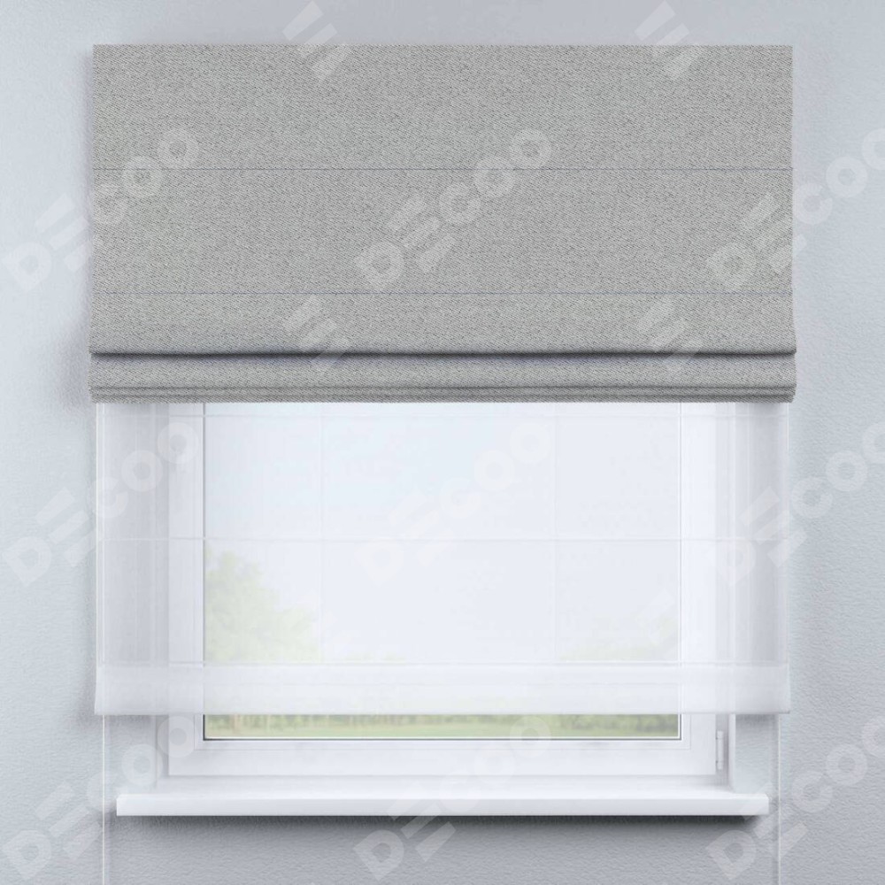Двойная римская штора «День-ночь» от производителя Cortin предназначена для использования в проёмах. Эта штора уникальна тем, что состоит из двух полотен. На лицевой стороне находится твид блэкаут светло-серый (артикул: 90936), обеспечивающий эффективное затемнение. В комплект также входит вторая ткань — легкий белый тюль (артикул: V-01), который добавляет изящества и легкости оформлению окна. Кроме того, доступны и другие разновидности ткани тюль, выбор которых доступен по  ссылке .