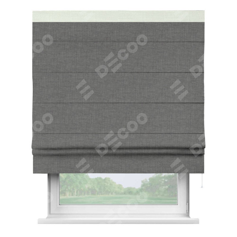 Римская штора производителя «Cortin», используется для проёма, пошита из ткани лён тёмно-серый, артикул 7441. Отделка шторы кантом «Кинг», ткань для канта используется из льна разной расцветки на выбор. Имеет универсальный механизм и подходит для монтажа: на потолок, на стену и в нишу.