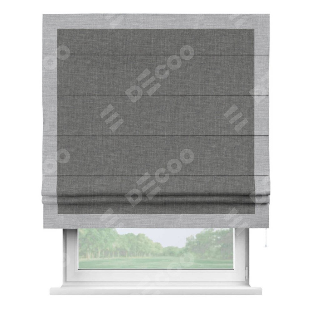 Римская штора производителя «Cortin», используется для проёма, пошита из ткани лён тёмно-серый, артикул 7441. Отделка шторы кантом «Чесс», ткань для канта используется из льна разной расцветки на выбор. Имеет универсальный механизм и подходит для монтажа: на потолок, на стену и в нишу.