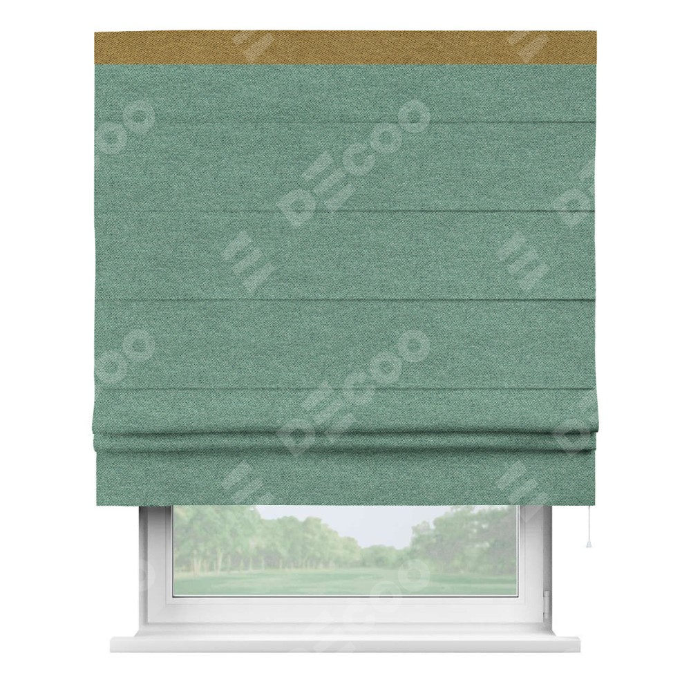 Римская штора производителя «Cortin», используется для проёма, пошита из ткани твид блэкаут бирюзовый, артикул 90934. Отделка шторы кантом «Кинг», ткань для канта используется из твида разной расцветки на выбор. Имеет универсальный механизм и подходит для монтажа: на потолок, на стену и в нишу.
