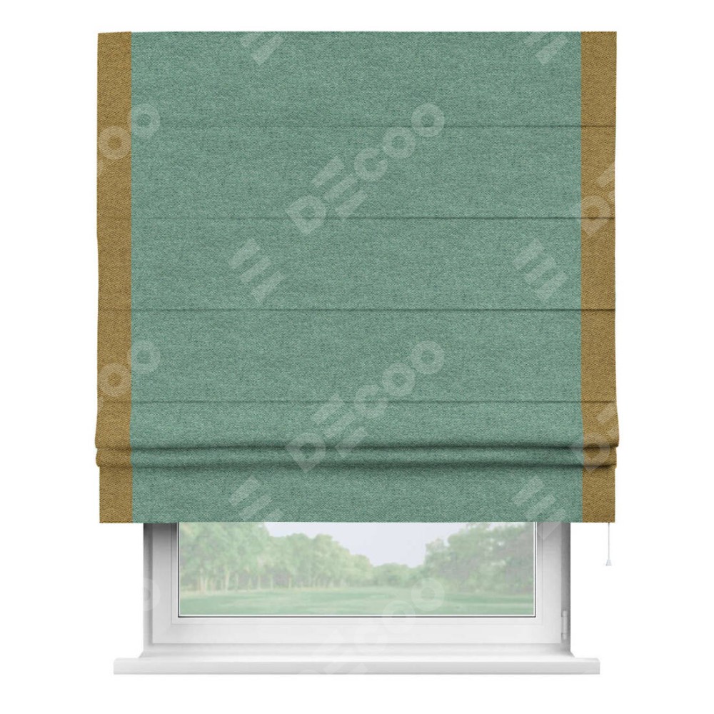 Римская штора производителя «Cortin», используется для проёма, пошита из ткани твид блэкаут бирюзовый, артикул 90934. Отделка шторы кантом «Стрим Дуо», ткань для канта используется из твида разной расцветки на выбор. Имеет универсальный механизм и подходит для монтажа: на потолок, на стену и в нишу.