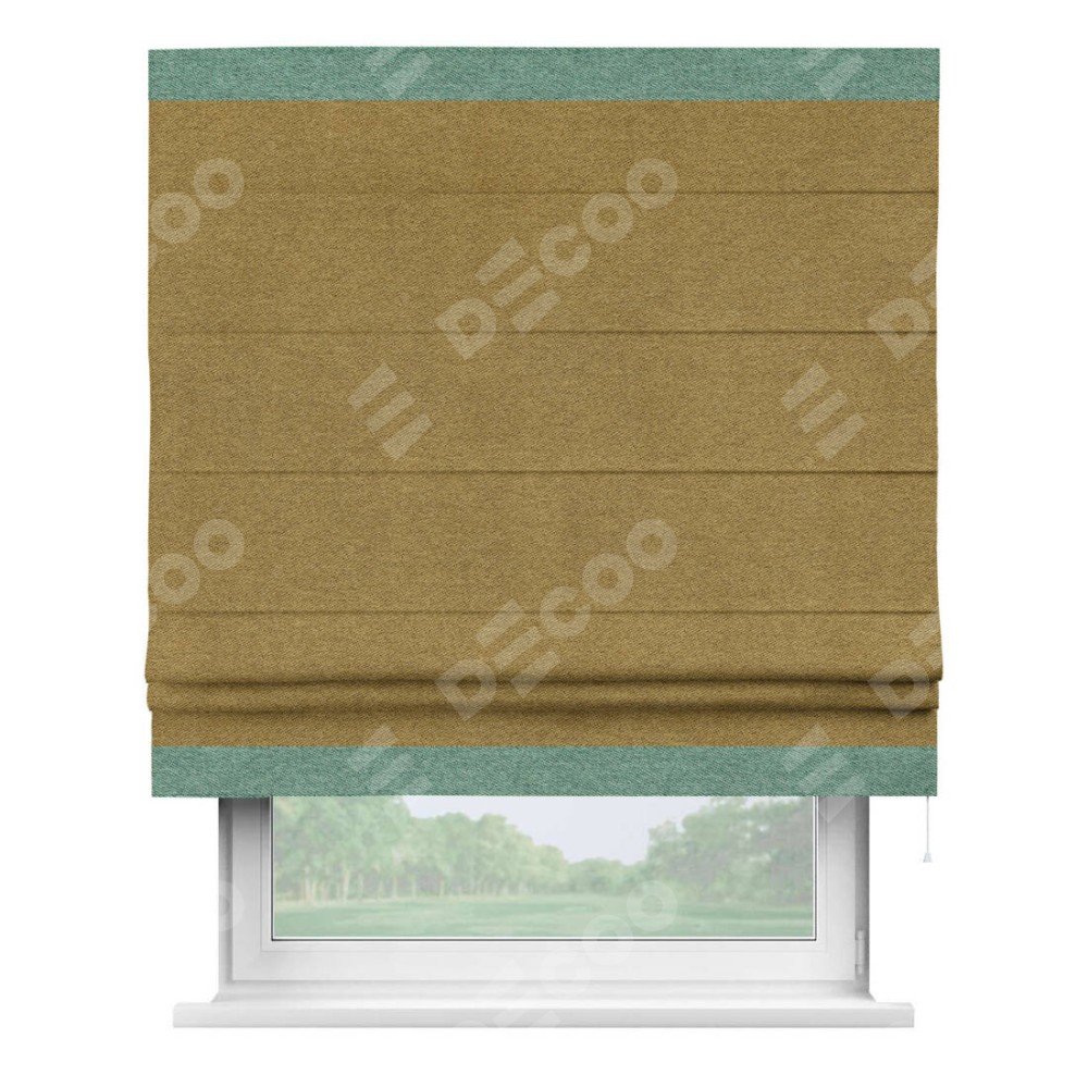 Римская штора производителя «Cortin», используется для проёма, пошита из ткани твид блэкаут горчица, артикул 91237. Отделка шторы кантом «Горизонт», ткань для канта используется из твида разной расцветки на выбор. Имеет универсальный механизм и подходит для монтажа: на потолок, на стену и в нишу.