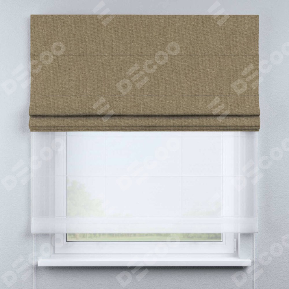 Двойная римская штора «День-ночь» от производителя Cortin предназначена для использования в проёмах. Эта штора уникальна тем, что состоит из двух полотен. На лицевой стороне находится лён димаут тёмно-бежевый (артикул: 16261), обеспечивающий эффективное затемнение. В комплект также входит вторая ткань — легкий белый тюль (артикул: V-01), который добавляет изящества и легкости оформлению окна. Кроме того, доступны и другие разновидности ткани тюль, выбор которых доступен по ссылке .
