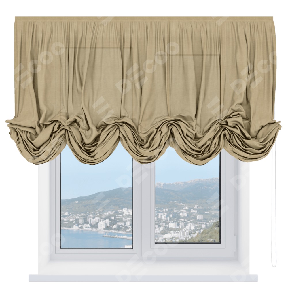 Австрийская штора производителя «Cortin», используется для проёма, пошита из ткани лён бежевый, артикул ткани 7442. Имеет универсальный механизм и подходит для монтажа: на потолок и на стену.