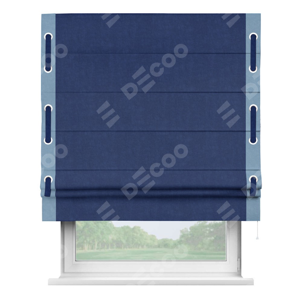 Если у вас уже установлена наша штора, то вам не обязательно снова покупать весь продукт — вы можете легко купить и заменить только ткань. Новая ткань доступна для заказа на нашем сайте, и её замена не требует особых усилий, позволяя вам экономить и обновлять ваш интерьер без лишних расходов. Римская штора производителя «Cortin», используется для проёма, пошита из ткани канвас синий, артикул ткани v-573. Отделка шторы кантом «Стрим Дуо» на кантах расположены люверсы с пояском, ткань для канта используется из вельвета разной расцветки на выбор. Ткань для пояска обычно используется из основной ткани шторы, а так же можно сделать из любой расцветки по желанию. Имеет универсальный механизм и подходит для монтажа: на потолок, на стену и в нишу.