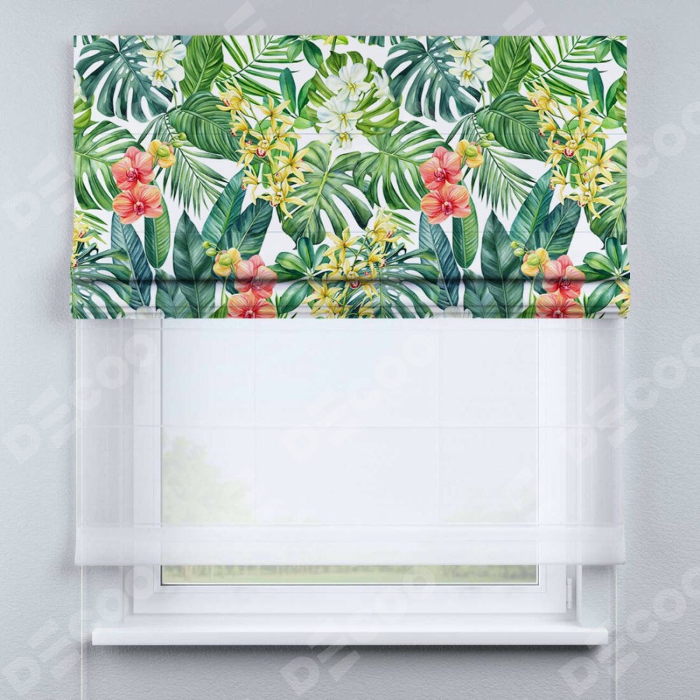 Двойная римская штора «День-ночь» от производителя Cortin предназначена для использования в проёмах. Эта штора уникальна тем, что состоит из двух полотен. На лицевой стороне находится блэкаут с нанесением сублимационной печати «Орхидеи в тропиках», обеспечивающий эффективное затемнение. В комплект также входит вторая ткань — легкий белый тюль (артикул: V-01), который добавляет изящества и легкости оформлению окна. Кроме того, доступны и другие разновидности ткани тюль, выбор которых доступен по  ссылке .