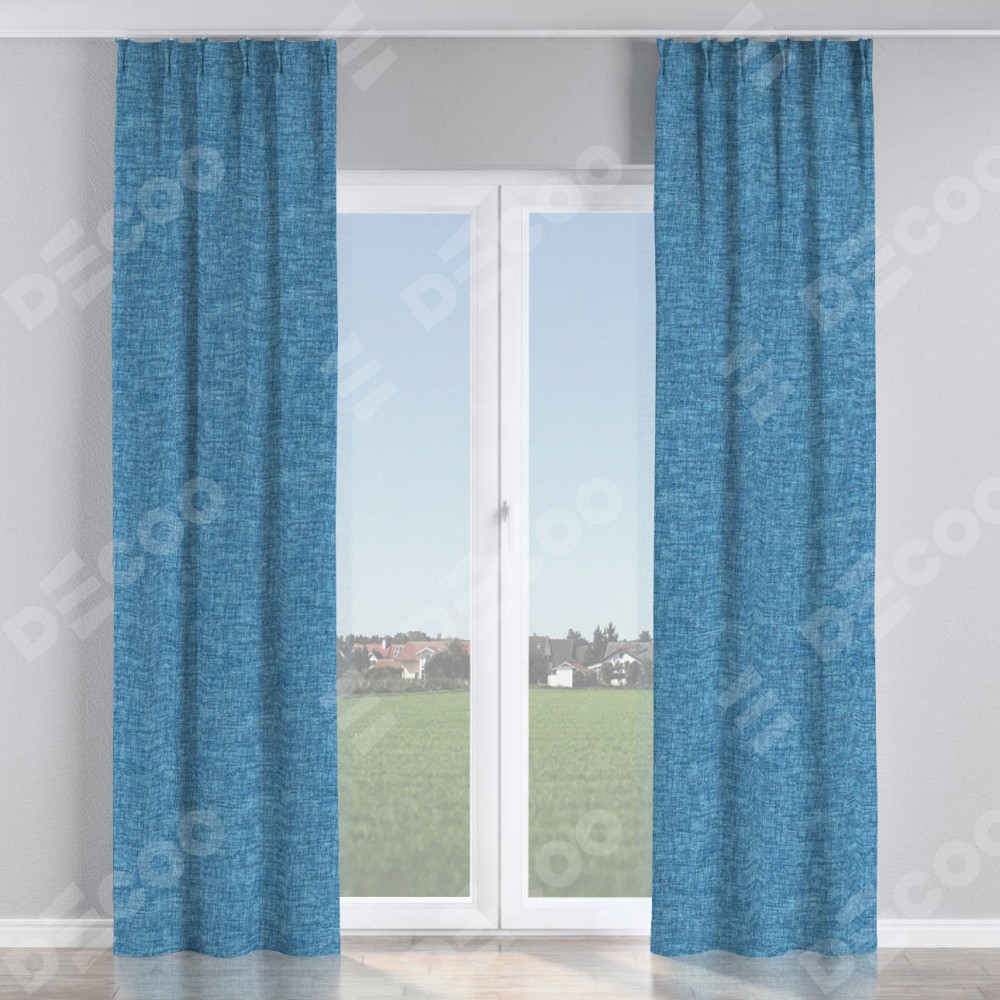 Комплект прямых штор, от производителя «Cortin», пошиты из ткани рогожка димаут джинс, артикул ткани 91026. С изнаночной стороны в верхней части штор пристрачивается шторная лента с декоративными складками «Кустик». Для создания элегантных складок прямые шторы шьются по стандарту с коэффициентом 1:2 (на 100 см. ширины проёма 200 см. ширины ткани).