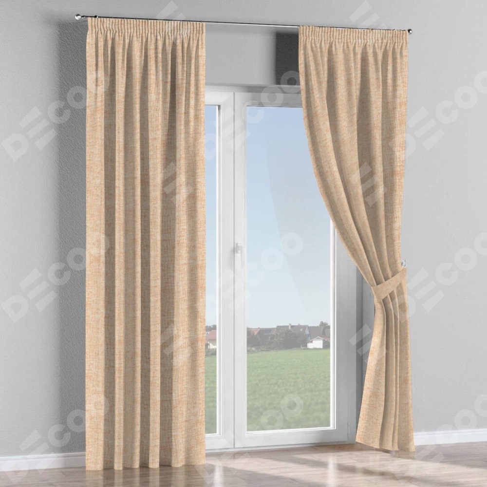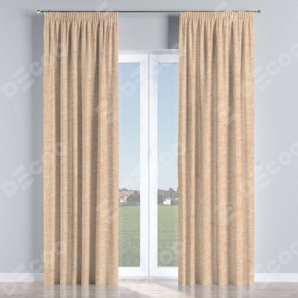 Комплект прямых штор, от производителя «Cortin», пошиты из ткани рогожка димаут персиковый, артикул ткани 91016. С изнаночной стороны в верхней части штор пристрачивается шторная лента с декоративными складками «Карандаш». Для создания элегантных складок прямые шторы шьются по стандарту с коэффициентом 1:2 (на 100 см. ширины проёма 200 см. ширины ткани).