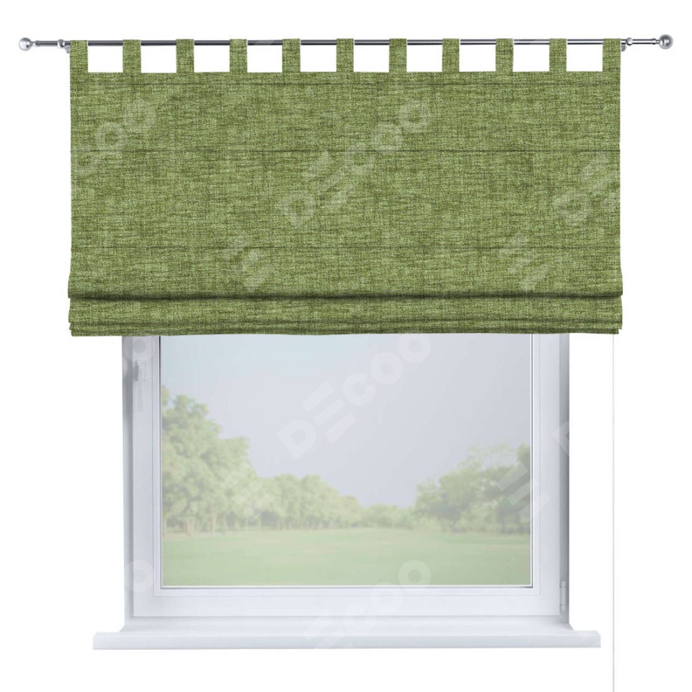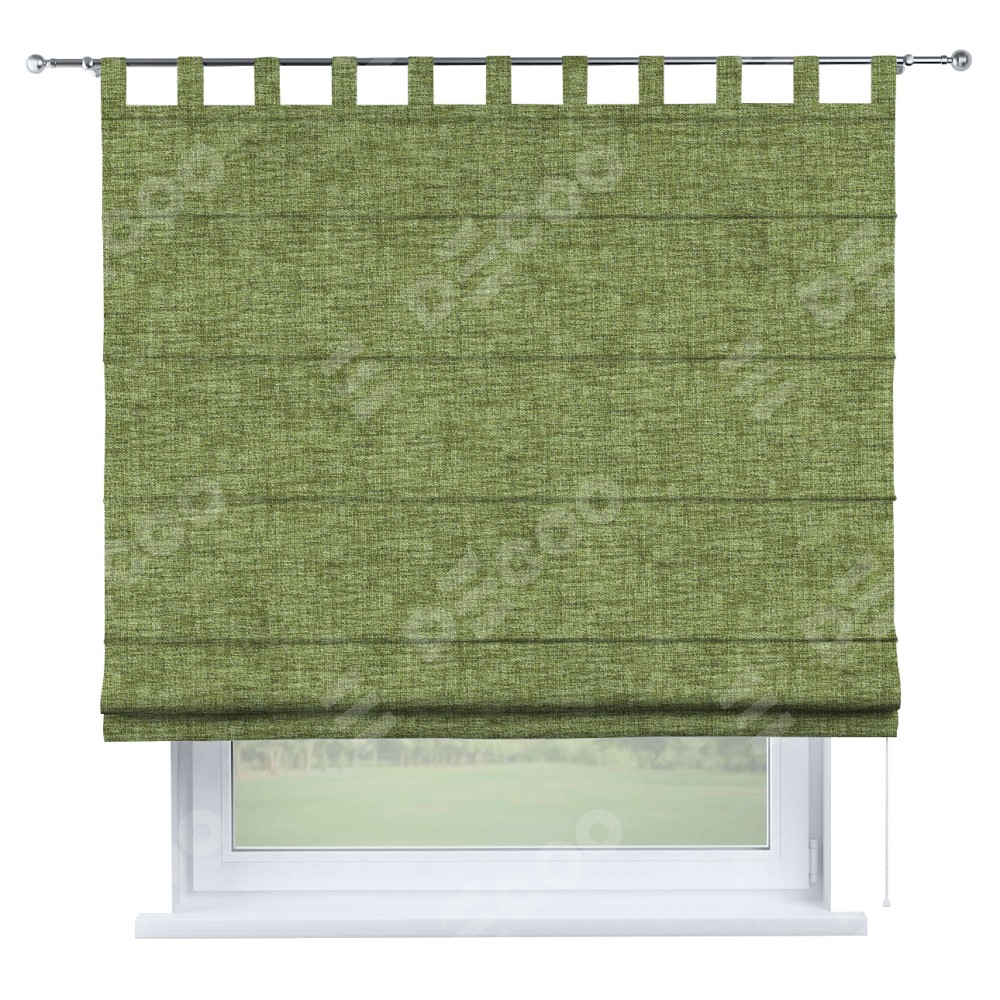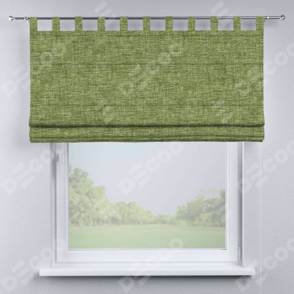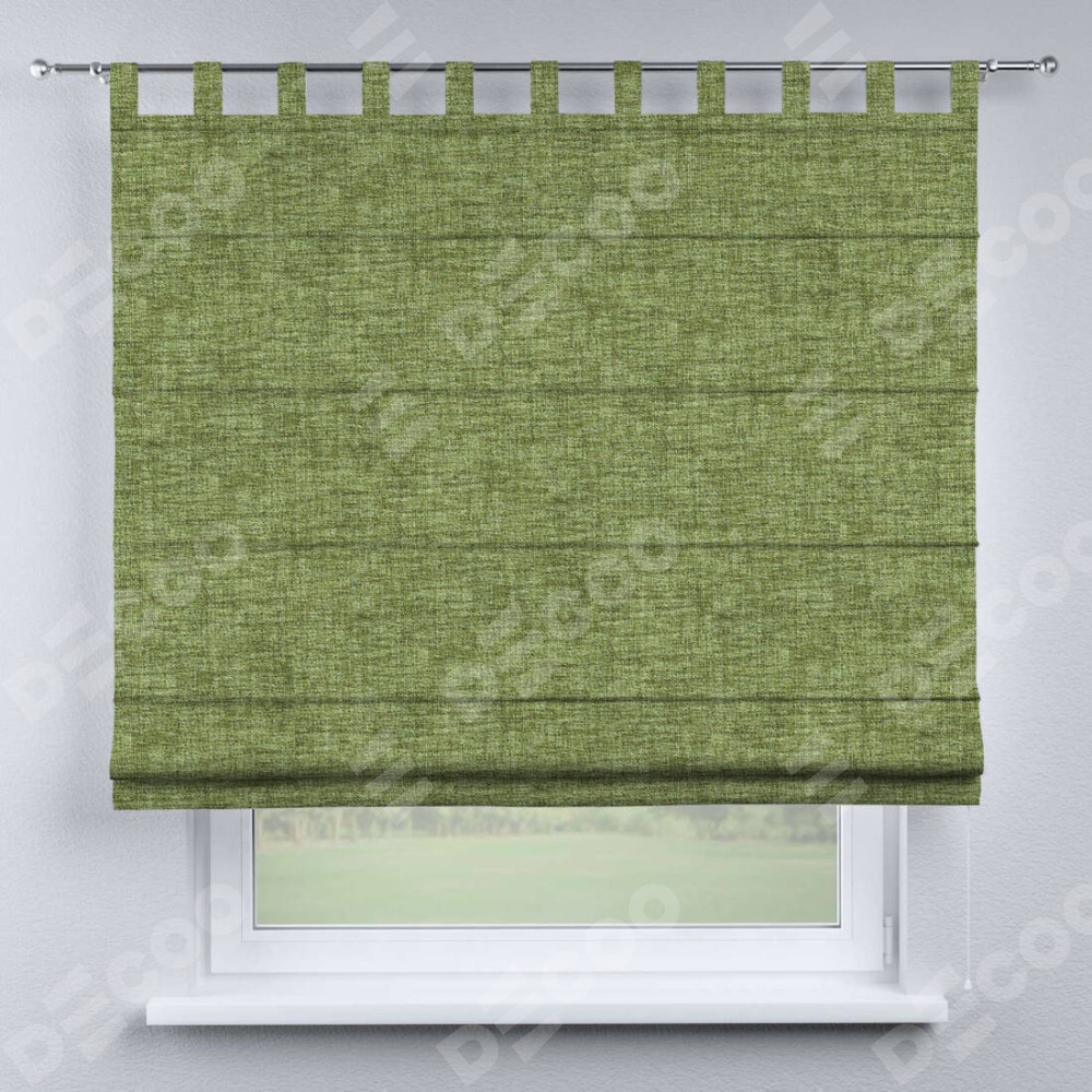 Римская штора производителя «Cortin», используется для проёма, пошита из ткани рогожка димаут травяной, артикул ткани 91021. Данная модель пошита на петлях, комплектуется на выбор круглым карнизом и подходит для монтажа на стену. Римская штора на петлях имеет простую систему регулировки высоты, отличительным преимуществом данной модели является простой способ монтажа. Достаточно повесить ее на трубу и штора готова!
