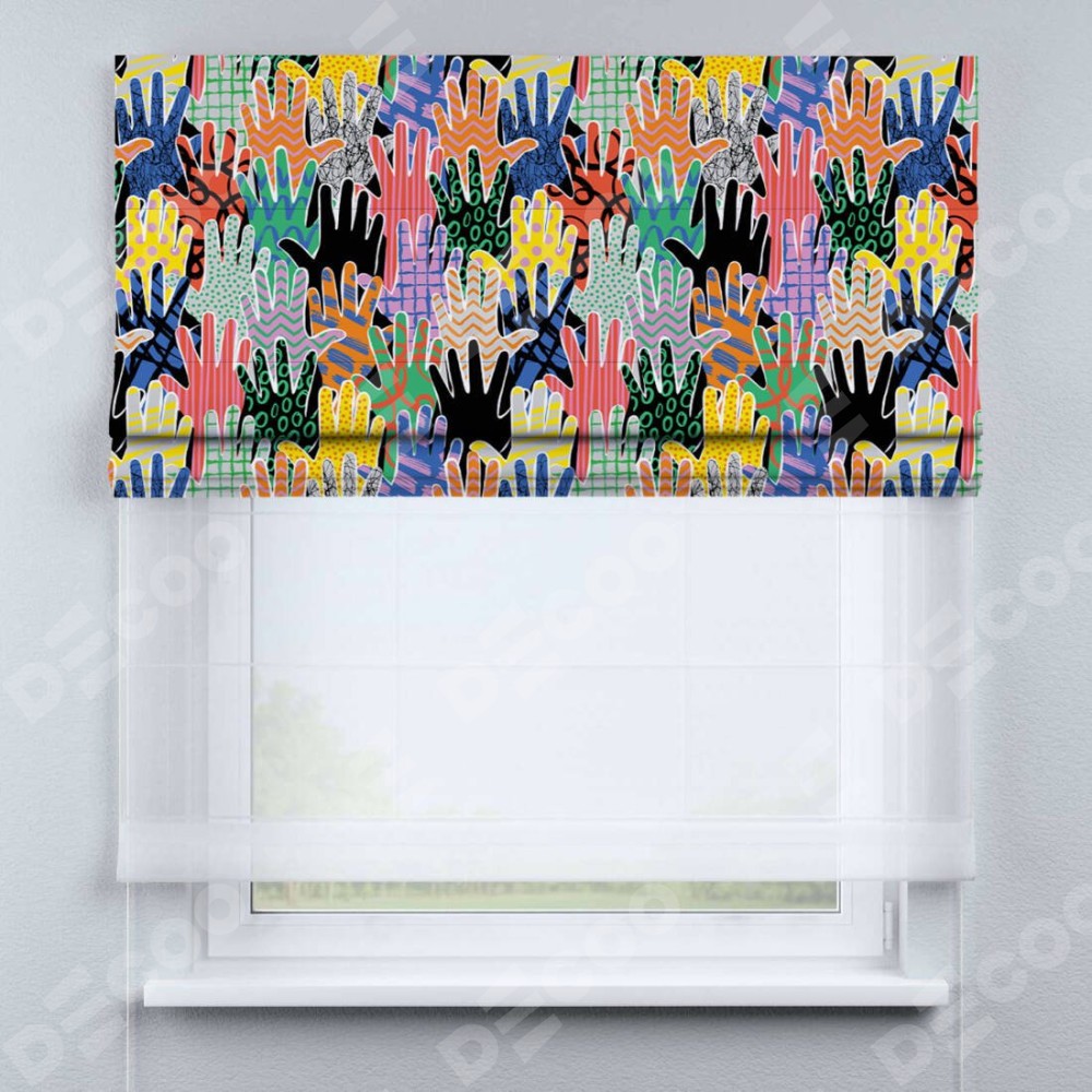 Двойная римская штора «День-ночь» от производителя Cortin предназначена для использования в проёмах. Эта штора уникальна тем, что состоит из двух полотен. На лицевой стороне находится блэкаут с нанесением сублимационной печати «Коллаж поп-арт», обеспечивающий эффективное затемнение. В комплект также входит вторая ткань — легкий белый тюль (артикул: V-01), который добавляет изящества и легкости оформлению окна. Кроме того, доступны и другие разновидности ткани тюль, выбор которых доступен по ссылке .