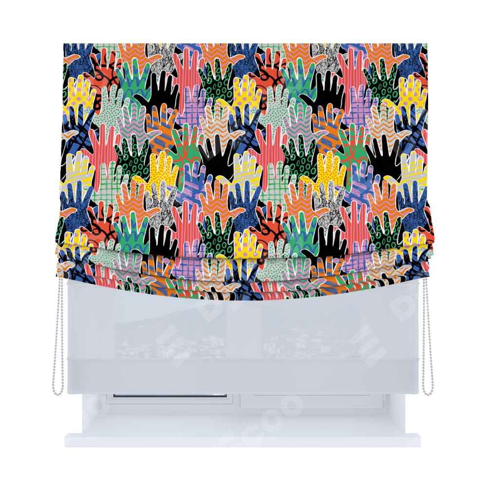 Римская штора день-ночь производителя «Cortin», используется для проёма, пошита из двух полотен, с лицевой блэкаут с нанесением сублимационной печати «Коллаж поп-арт», вторая ткань тюль (по стандарту комплектуется тюль белого цвета артикул V-01). Имеет универсальный механизм и подходит для монтажа: на потолок, на стену и в нишу. Удобное управление каждой шторой отдельно.