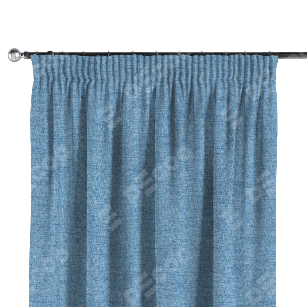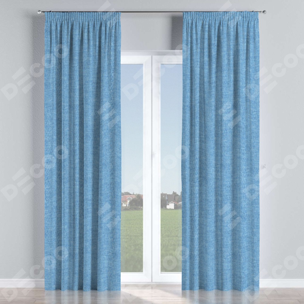 Комплект прямых штор, от производителя «Cortin», пошиты из ткани рогожка димаут голубой, артикул ткани 91025. С изнаночной стороны в верхней части штор пристрачивается шторная лента с декоративными складками «Карандаш». Для создания элегантных складок прямые шторы шьются по стандарту с коэффициентом 1:2 (на 100 см. ширины проёма 200 см. ширины ткани).