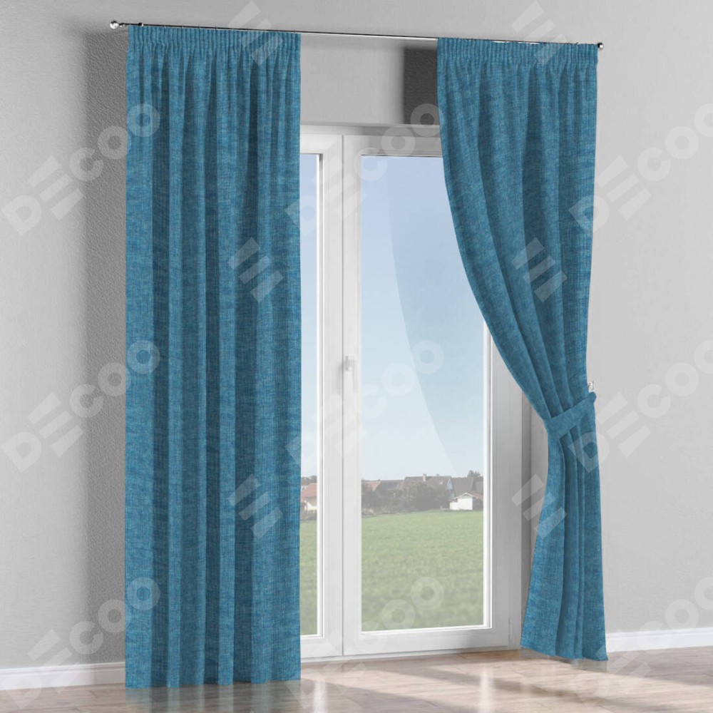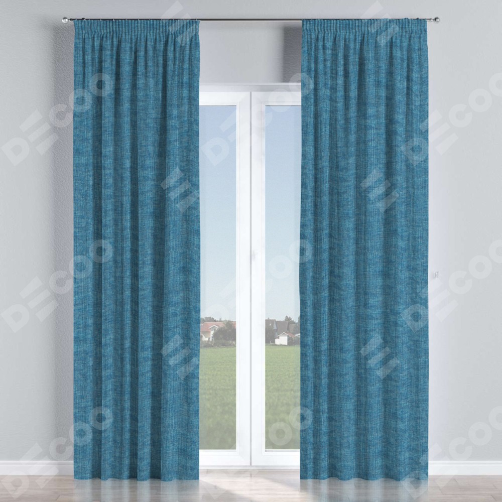 Комплект прямых штор, от производителя «Cortin», пошиты из ткани рогожка димаут лазурно-синий, артикул ткани 91024. С изнаночной стороны в верхней части штор пристрачивается шторная лента с декоративными складками «Карандаш». Для создания элегантных складок прямые шторы шьются по стандарту с коэффициентом 1:2 (на 100 см. ширины проёма 200 см. ширины ткани).