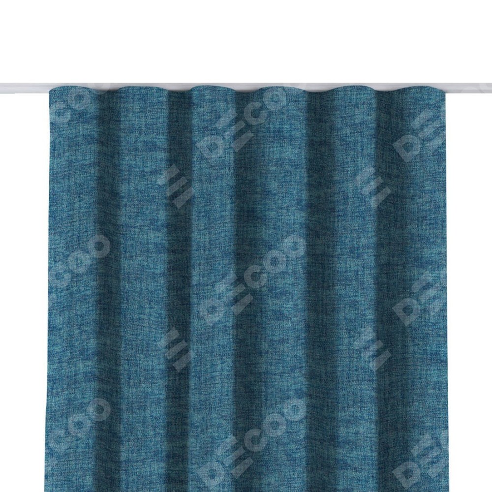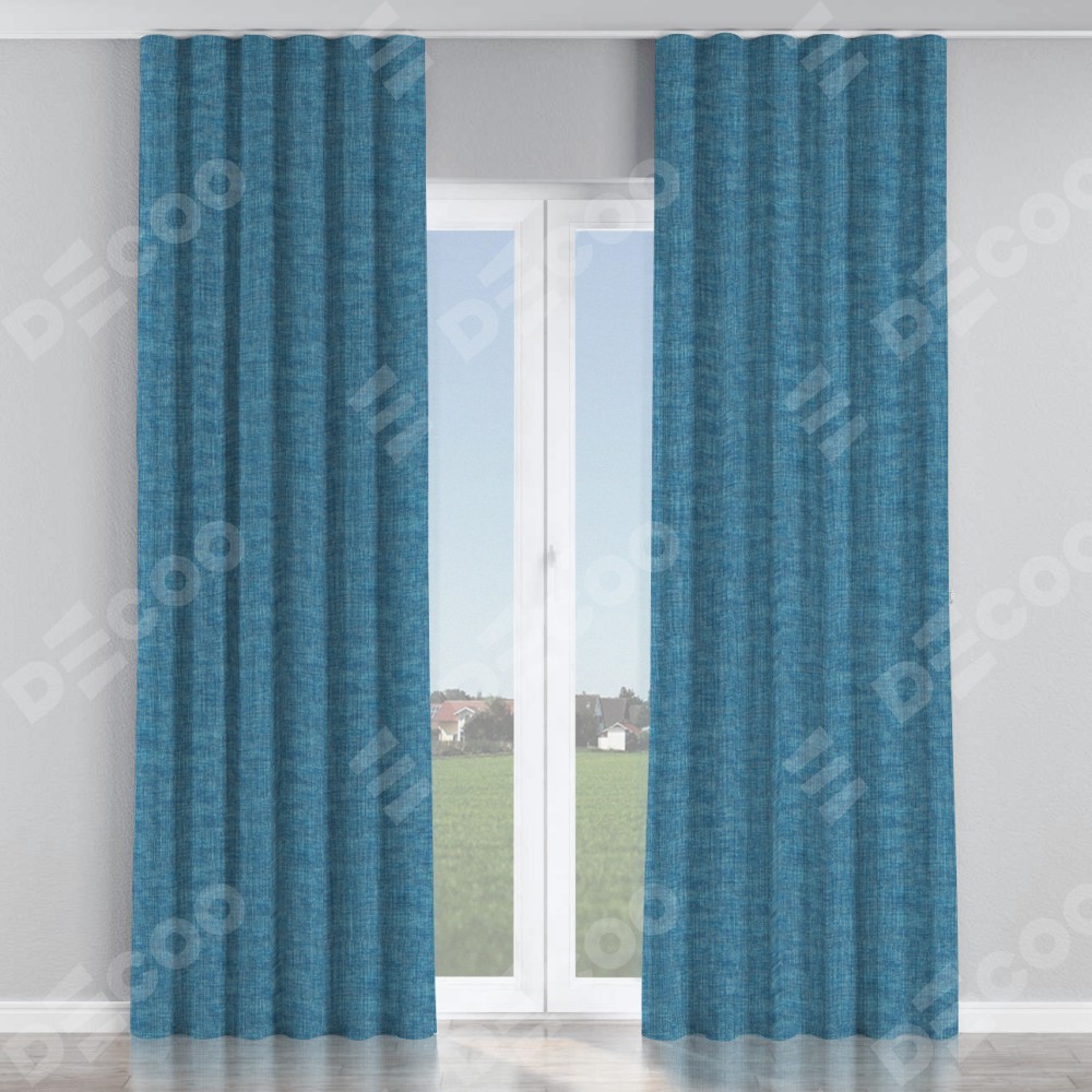 Комплект прямых штор, от производителя «Cortin», пошиты из ткани рогожка димаут лазурно-синий, артикул ткани 91024. С изнаночной стороны в верхней части штор пристрачивается шторная лента с декоративными складками «Волна». Для создания элегантных складок прямые шторы шьются по стандарту с коэффициентом 1:2 (на 100 см. ширины проёма 200 см. ширины ткани).