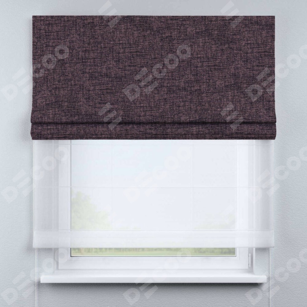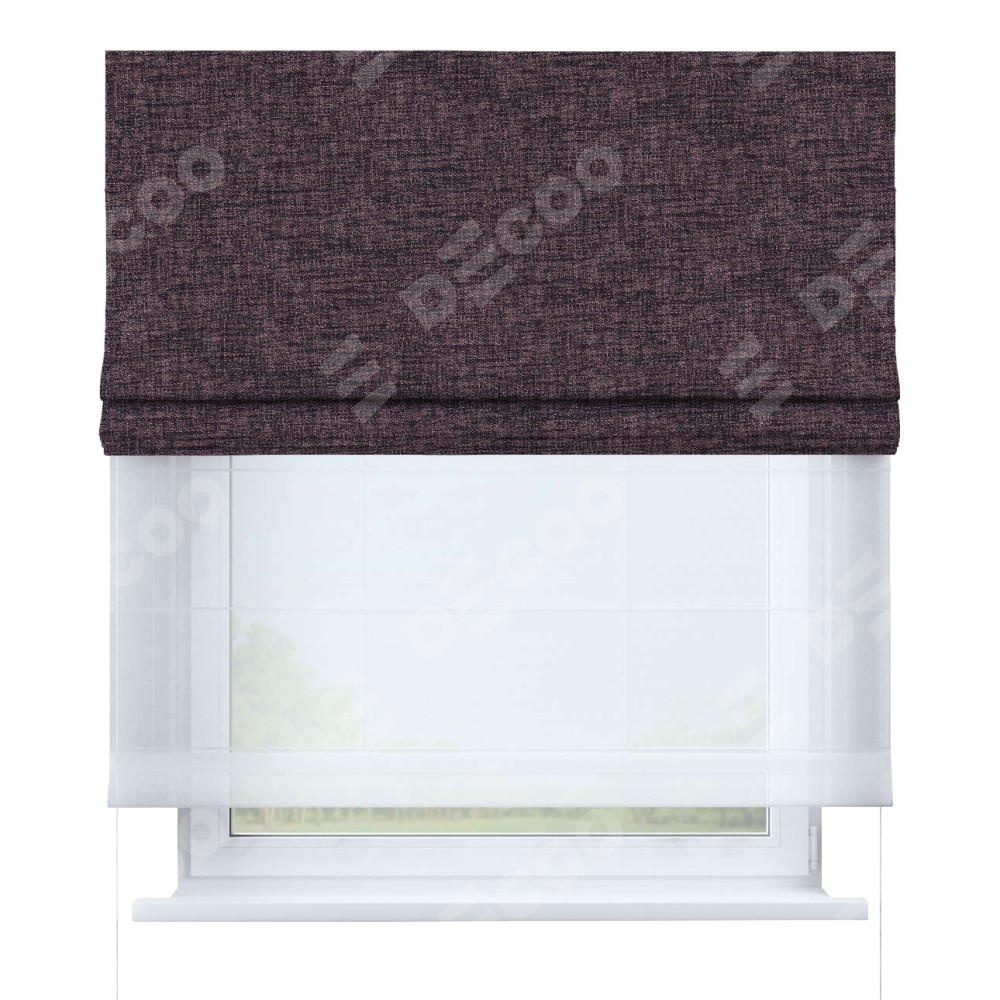 Двойная римская штора «День-ночь» от производителя Cortin предназначена для использования в проёмах. Эта штора уникальна тем, что состоит из двух полотен. На лицевой стороне находится рогожка димаут розово-коричневый (артикул: 91020), обеспечивающий эффективное затемнение. В комплект также входит вторая ткань — легкий белый тюль (артикул: V-01), который добавляет изящества и легкости оформлению окна. Кроме того, доступны и другие разновидности ткани тюль, выбор которых доступен по  ссылке .