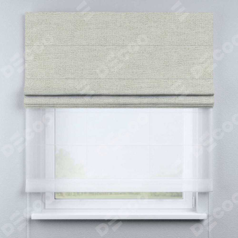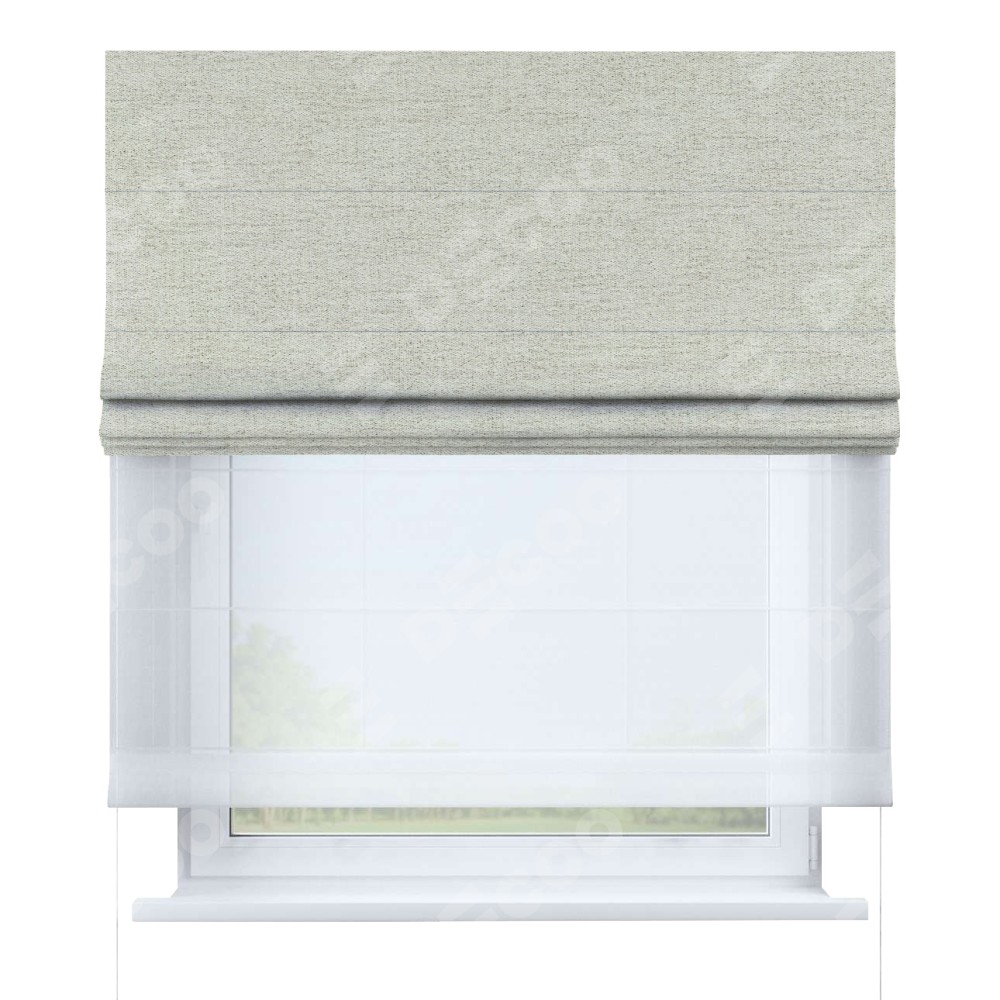 Двойная римская штора «День-ночь» от производителя Cortin предназначена для использования в проёмах. Эта штора уникальна тем, что состоит из двух полотен. На лицевой стороне находится рогожка димаут серо-бежевый (артикул: 91014), обеспечивающий эффективное затемнение. В комплект также входит вторая ткань — легкий белый тюль (артикул: V-01), который добавляет изящества и легкости оформлению окна. Кроме того, доступны и другие разновидности ткани тюль, выбор которых доступен по  ссылке .