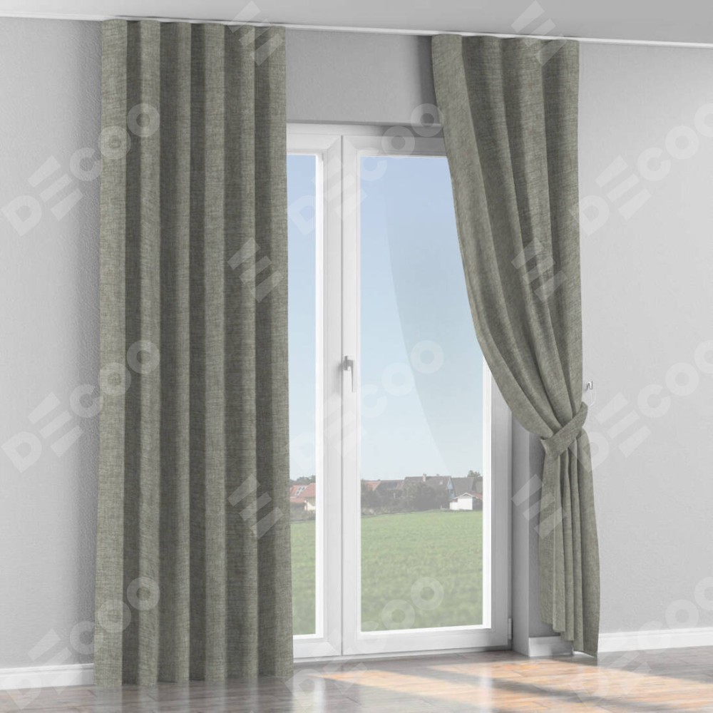 Комплект прямых штор, от производителя «Cortin», пошиты из ткани рогожка димаут серый дуб, артикул ткани 91028. С изнаночной стороны в верхней части штор пристрачивается шторная лента с декоративными складками «Волна». Для создания элегантных складок прямые шторы шьются по стандарту с коэффициентом 1:2 (на 100 см. ширины проёма 200 см. ширины ткани).