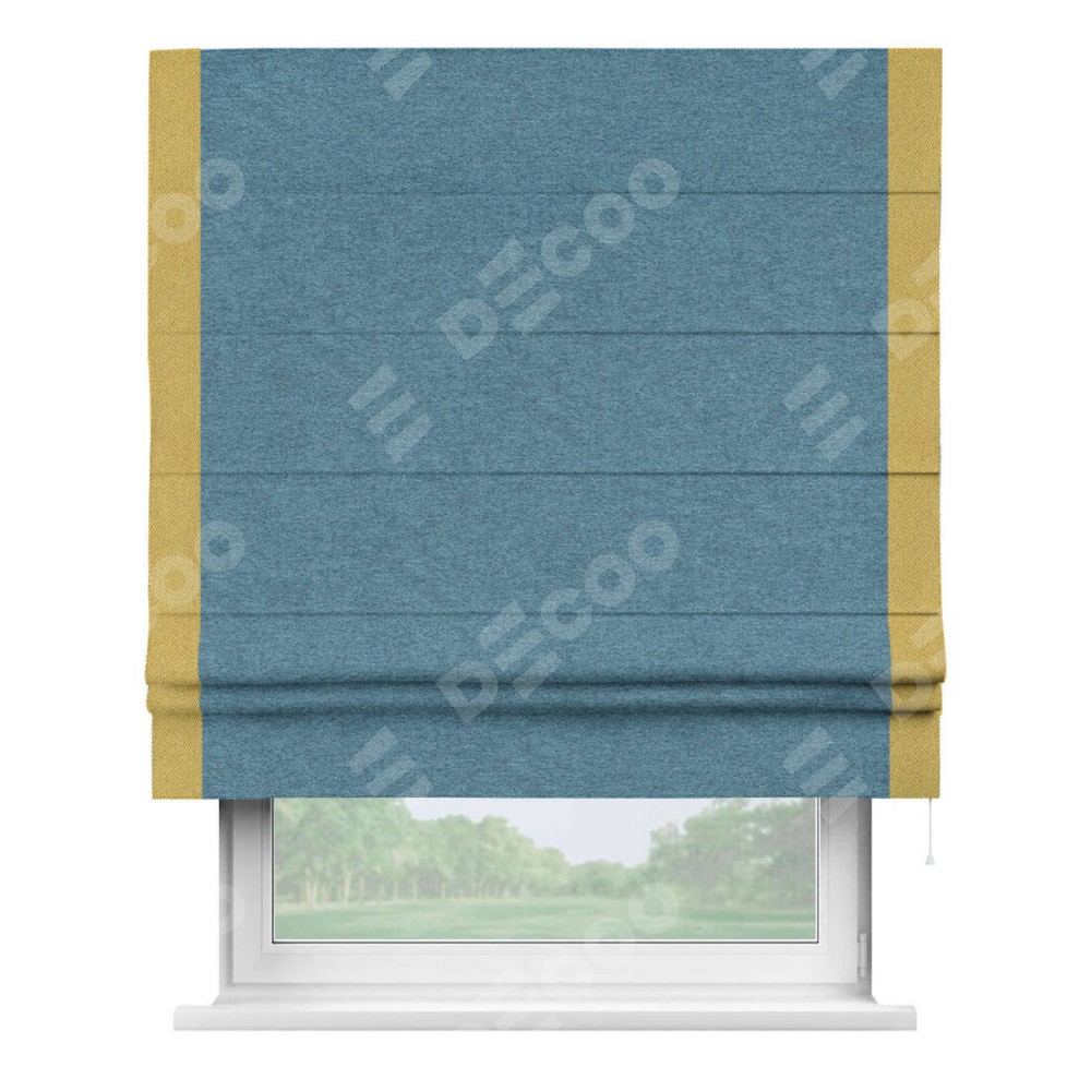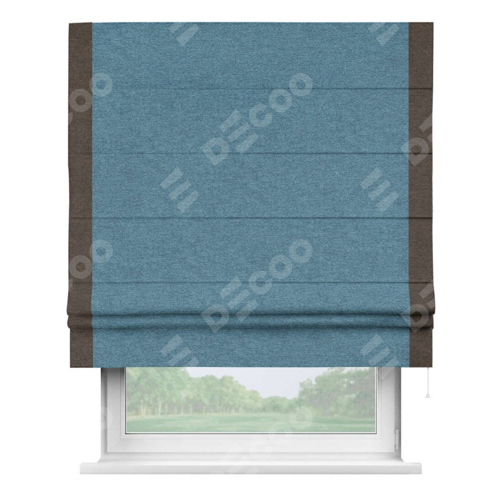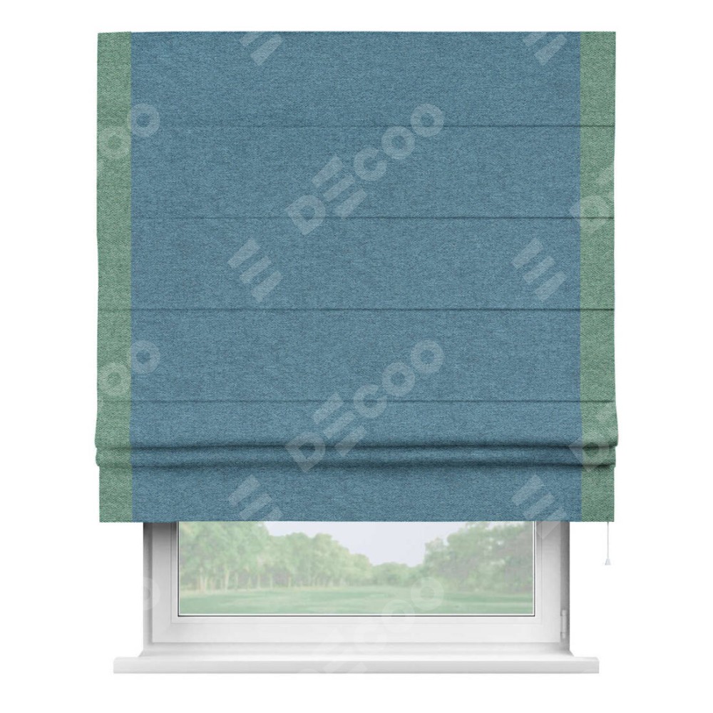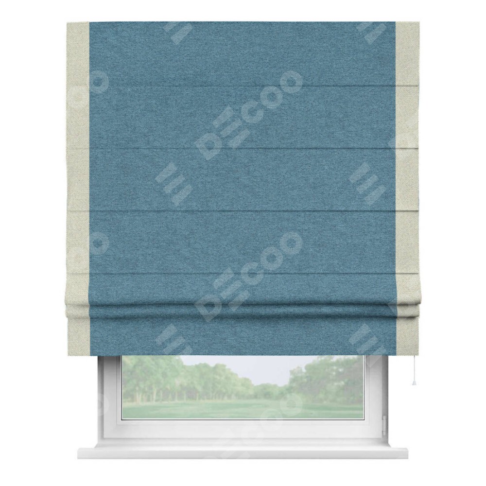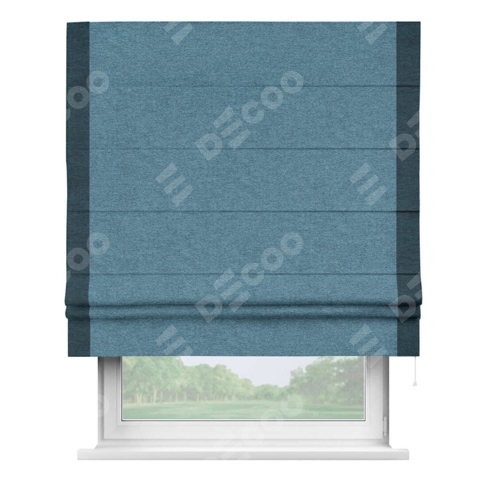 Римская штора пошита из ткани твид блэкаут светло-синий, артикул: 90935, с отделкой кантом «Стрим Дуо» выделяется наличием кантов по обоим бокам шторы, слева и справа. Этот дизайн придает шторе аккуратный и завершенный вид, акцентируя вертикальные линии и визуально вытягивая окно в высоту. Отделка кантом по бокам не только украшает штору, но и служит практической функцией, укрепляя края и продлевая срок службы изделия.