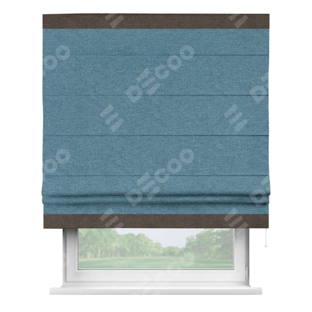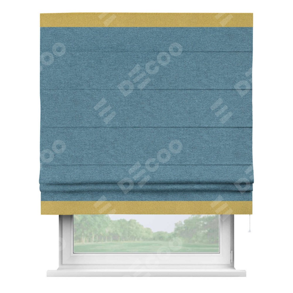 Римская штора пошита из ткани твид блэкаут светло-синий, артикул: 90935, с отделкой кантом «Горизонт» предлагает уникальное дизайнерское решение, при котором кант располагается только вверху и снизу шторы. Такое решение делает акцент на горизонтальных линиях, визуально расширяя пространство и придавая окну более строгий и организованный вид. Отделка кантом в этих ключевых местах не только украшает штору, но и способствует её долговечности, защищая наиболее уязвимые к износу края.