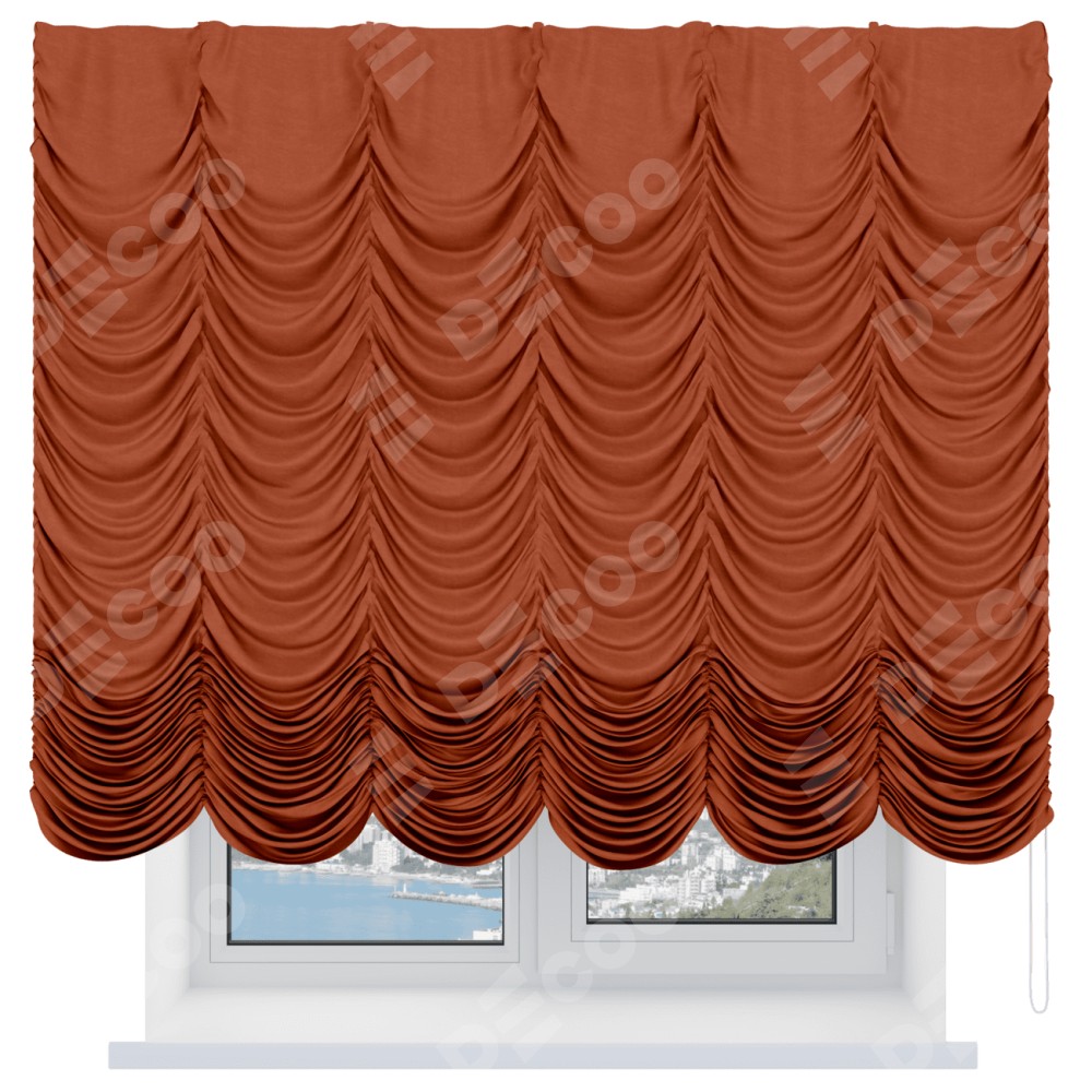 Французская штора производителя «Cortin», используется для проёма, пошита из ткани вельвет терракотовый, артикул ткани 85548. Имеет универсальный механизм и подходит для монтажа: на потолок и на стену.
