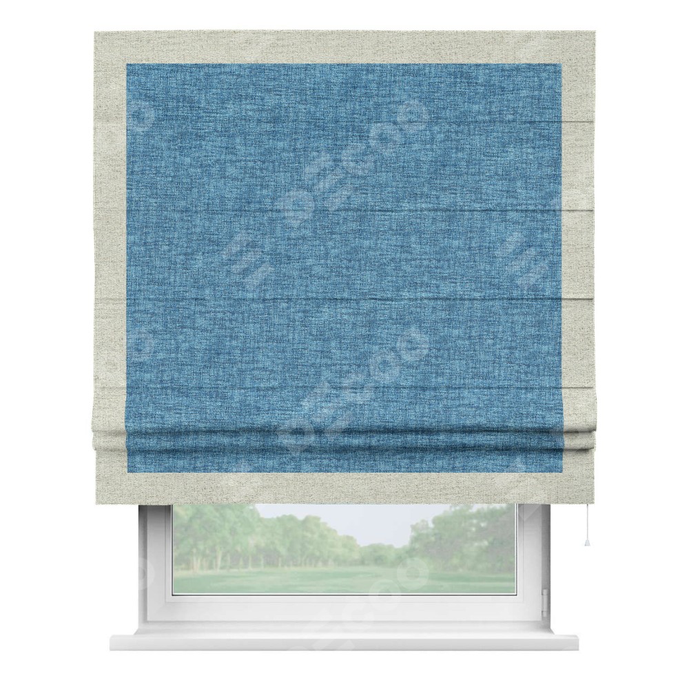 Римская штора пошита из ткани рогожка димаут джинс, артикул: 91026, с отделкой кантом «Чесс» отличается своей уникальной деталью — наличием канта не только по бокам и снизу, но и сверху по всем краям шторы. Это придает шторе особенно аккуратный и завершенный вид, делая акцент на границах и форме шторы. Отделка кантом по всему периметру шторы усиливает её декоративные качества и подчеркивает строгую геометрию, что может быть особенно актуально для современных и минималистичных интерьеров.