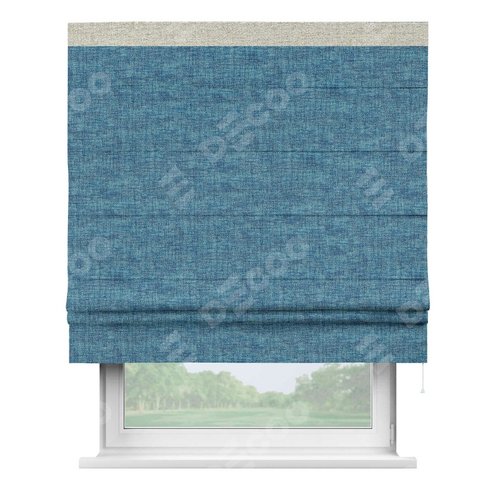 Римская штора пошита из ткани рогожка димаут лазурно-синий, артикул: 91024, с отделкой кантом «Кинг» отличается своей необычной особенностью: кант располагается исключительно сверху шторы. Такой дизайн делает акцент на верхней части окна, визуально поднимая потолок и придавая интерьеру более возвышенный и изысканный вид. Отделка кантом на верхней кромке не только украшает штору, но и может служить дополнительной защитой от износа в месте наибольшего контакта с механизмом управления шторой.
