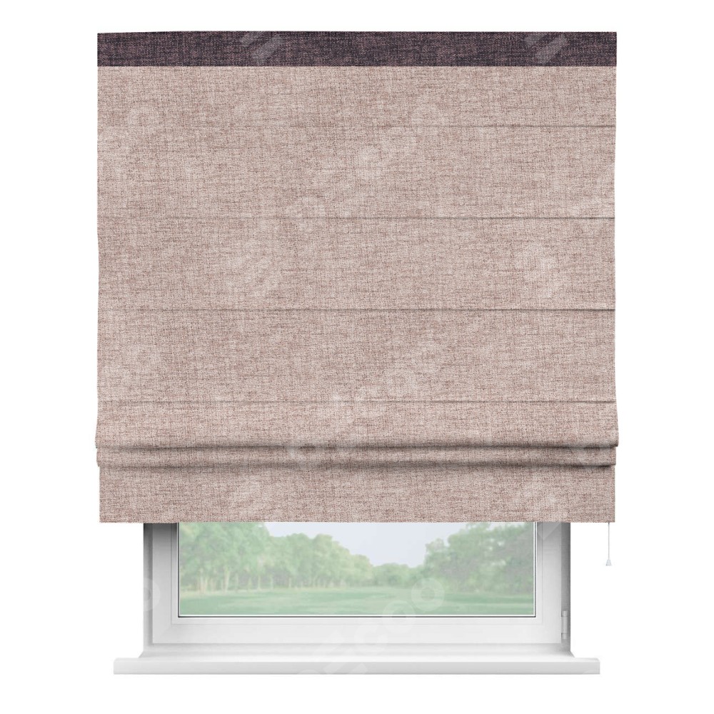 Римская штора пошита из ткани рогожка димаут пыльный розовый, артикул: 91019, с отделкой кантом «Кинг» отличается своей необычной особенностью: кант располагается исключительно сверху шторы. Такой дизайн делает акцент на верхней части окна, визуально поднимая потолок и придавая интерьеру более возвышенный и изысканный вид. Отделка кантом на верхней кромке не только украшает штору, но и может служить дополнительной защитой от износа в месте наибольшего контакта с механизмом управления шторой.