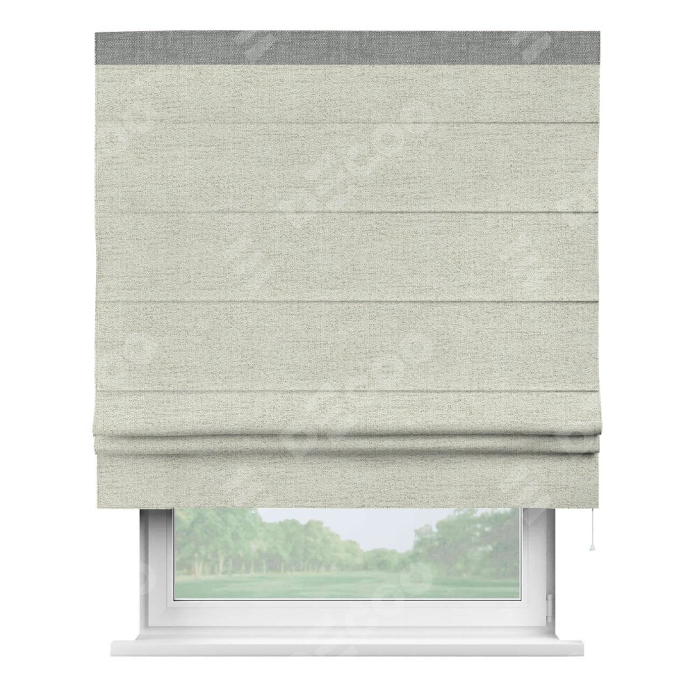 Римская штора пошита из ткани рогожка димаут серо-бежевый, артикул: 91014, с отделкой кантом «Кинг» отличается своей необычной особенностью: кант располагается исключительно сверху шторы. Такой дизайн делает акцент на верхней части окна, визуально поднимая потолок и придавая интерьеру более возвышенный и изысканный вид. Отделка кантом на верхней кромке не только украшает штору, но и может служить дополнительной защитой от износа в месте наибольшего контакта с механизмом управления шторой.