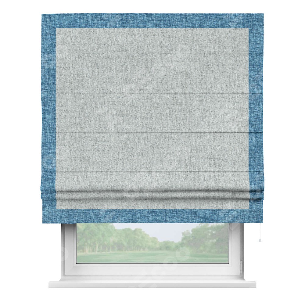 Римская штора пошита из ткани рогожка димаут серый, артикул: 91027, с отделкой кантом «Чесс» отличается своей уникальной деталью — наличием канта не только по бокам и снизу, но и сверху по всем краям шторы. Это придает шторе особенно аккуратный и завершенный вид, делая акцент на границах и форме шторы. Отделка кантом по всему периметру шторы усиливает её декоративные качества и подчеркивает строгую геометрию, что может быть особенно актуально для современных и минималистичных интерьеров.