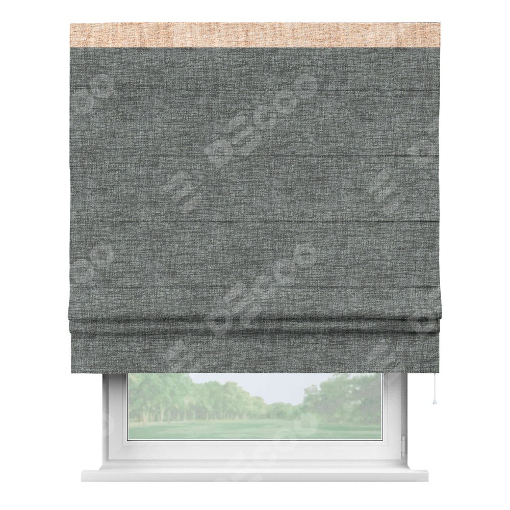Римская штора пошита из ткани рогожка димаут тёмно-серый, артикул: 91029, с отделкой кантом «Кинг» отличается своей необычной особенностью: кант располагается исключительно сверху шторы. Такой дизайн делает акцент на верхней части окна, визуально поднимая потолок и придавая интерьеру более возвышенный и изысканный вид. Отделка кантом на верхней кромке не только украшает штору, но и может служить дополнительной защитой от износа в месте наибольшего контакта с механизмом управления шторой.