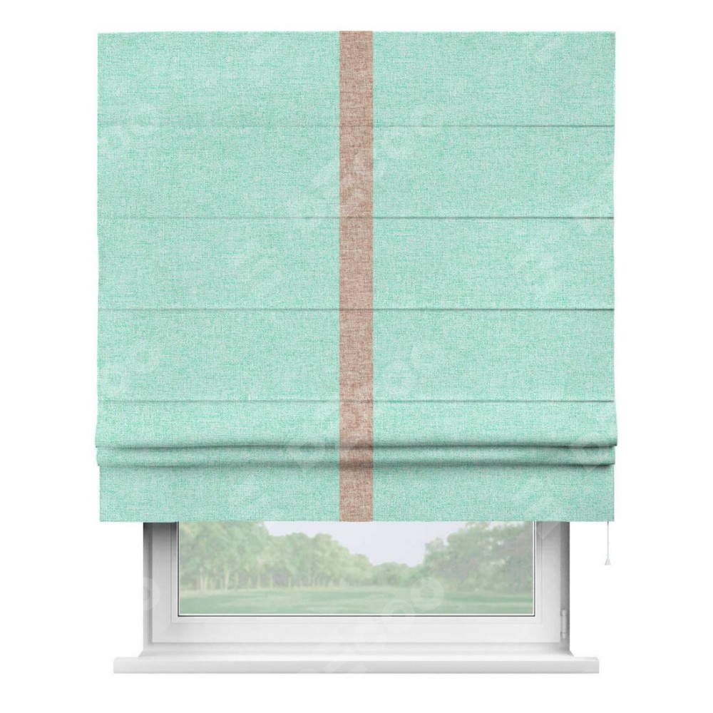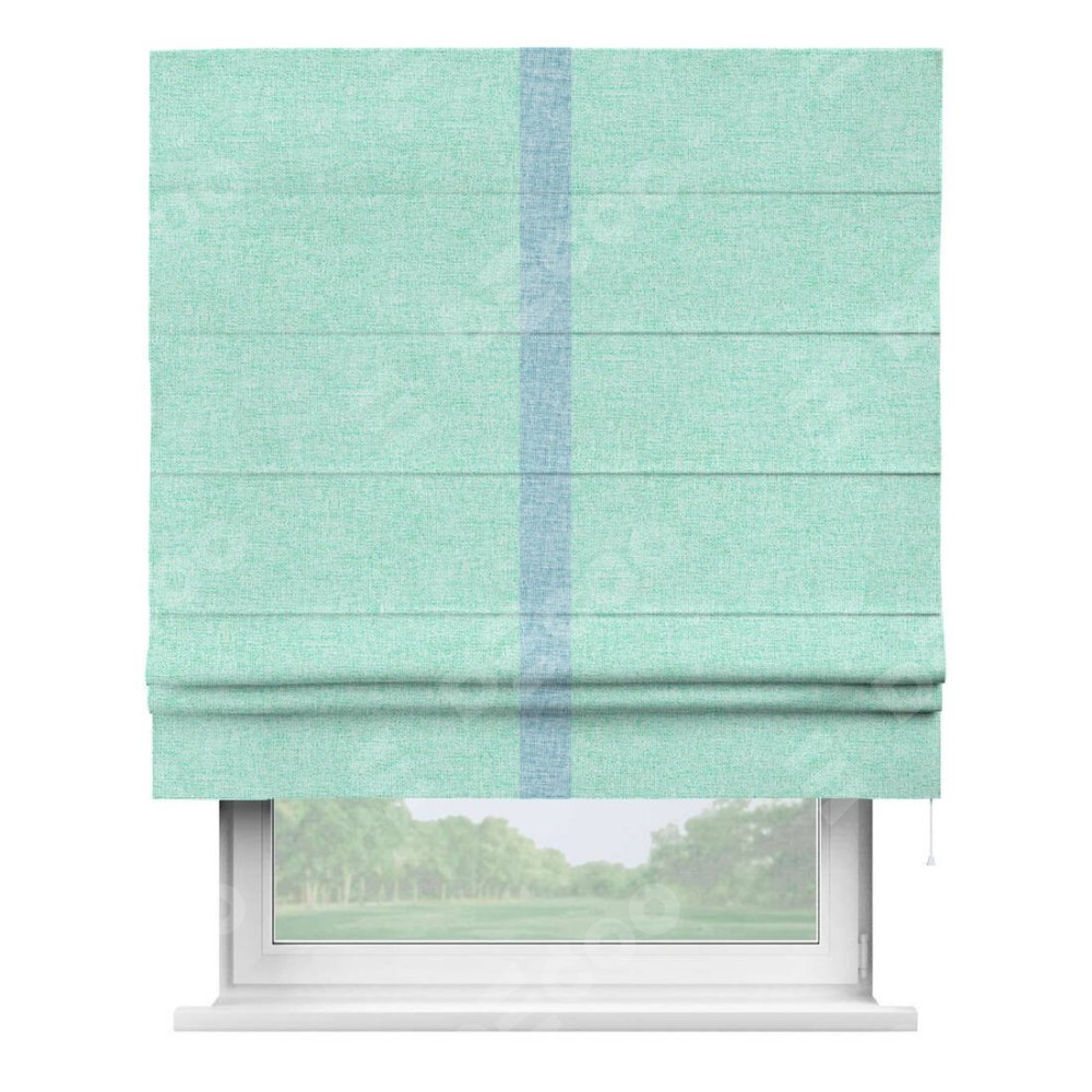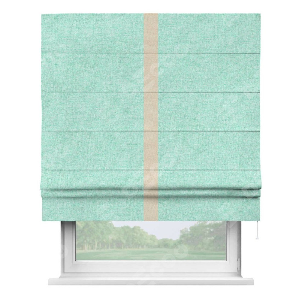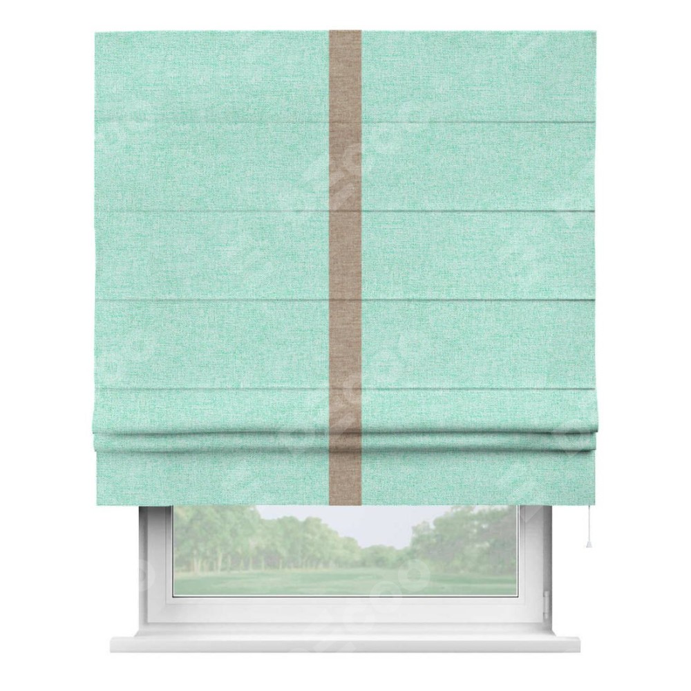 Римская штора пошита из ткани лён кашемир мятный, артикул: 21617, с отделкой кантом «Хайвэй» представляет собой уникальное и смелое дизайнерское решение, где кант расположен вертикально посередине шторы. Этот дизайн не только выделяет штору среди других вариантов оформления окон, но и создает интересный визуальный акцент, привлекая внимание к центру окна и разделяя штору на визуальные зоны. Такой нестандартный подход добавляет динамичности интерьеру и может быть использован для подчеркивания особенностей оформления помещения.