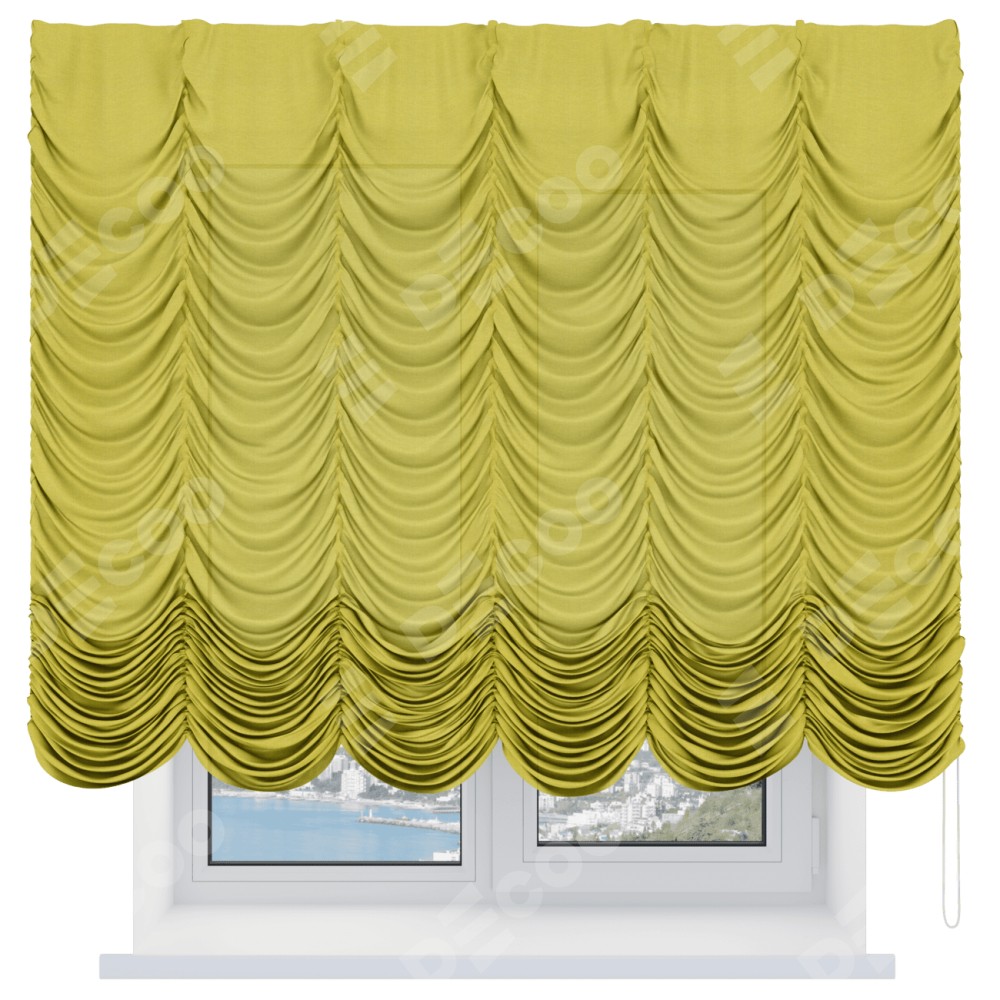 Французская штора производителя «Cortin», используется для проёма, пошита из ткани лён салатовый, артикул ткани 53437. Имеет универсальный механизм и подходит для монтажа: на потолок и на стену.