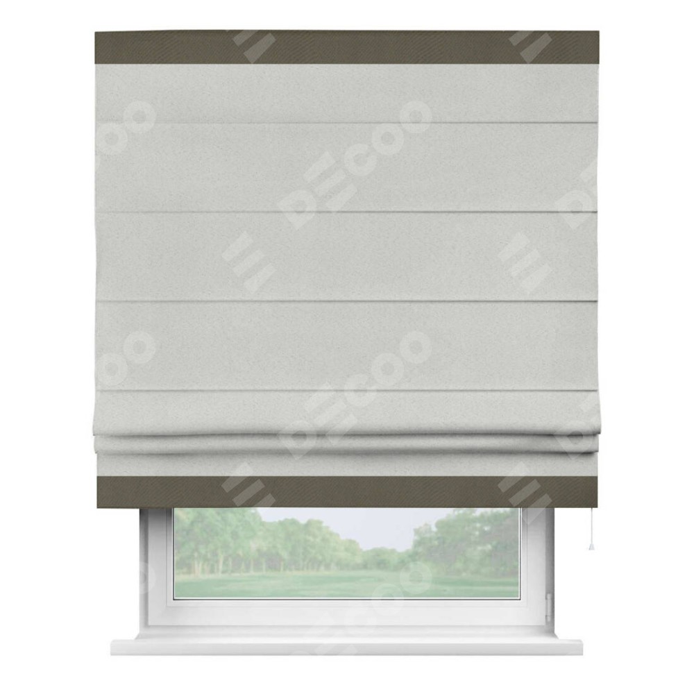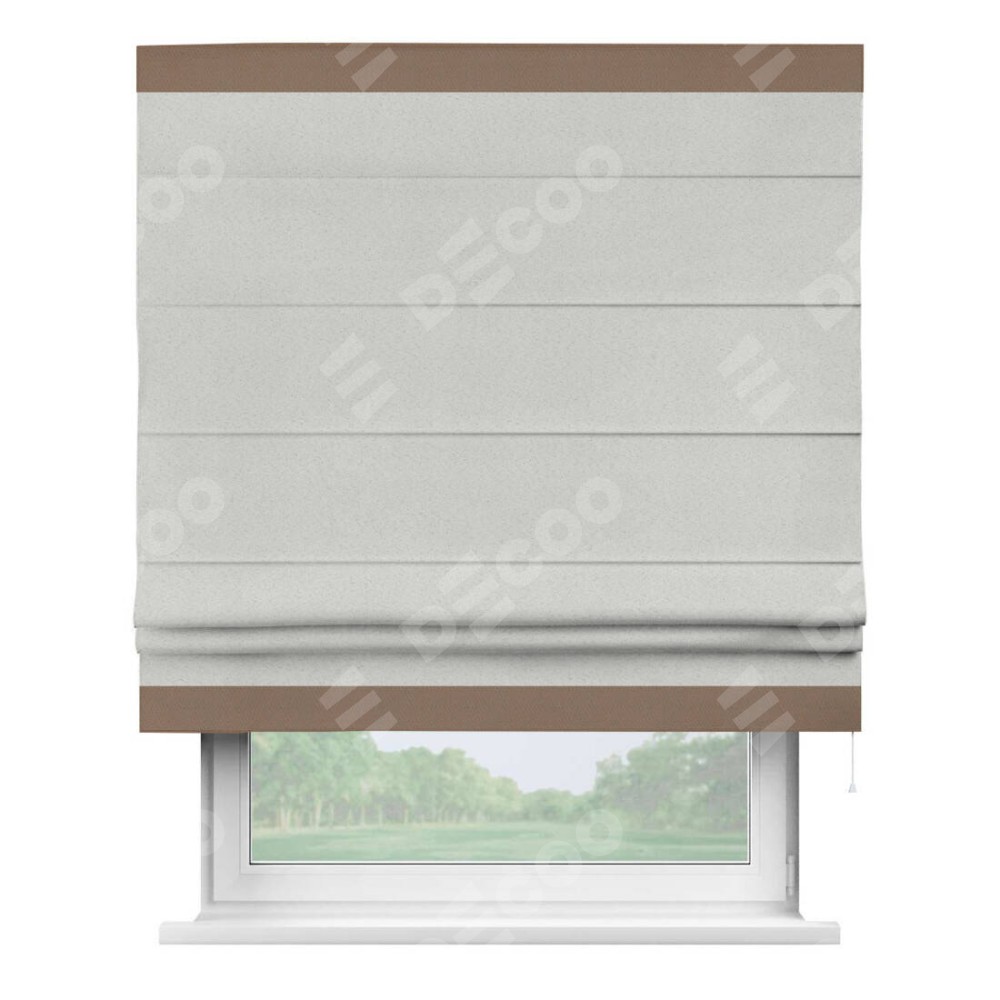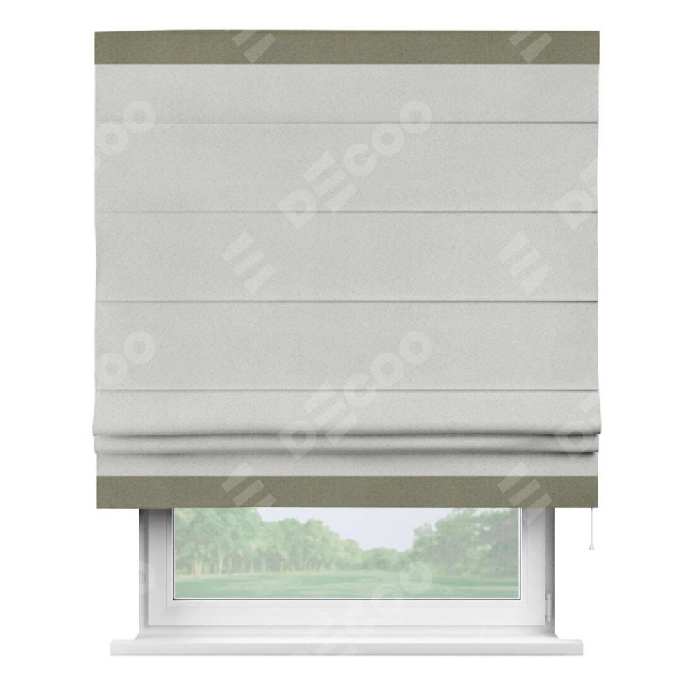 Римская штора пошита из ткани однотонный блэкаут милк, артикул: 23, с отделкой кантом «Горизонт» предлагает уникальное дизайнерское решение, при котором кант располагается только вверху и снизу шторы. Такое решение делает акцент на горизонтальных линиях, визуально расширяя пространство и придавая окну более строгий и организованный вид. Отделка кантом в этих ключевых местах не только украшает штору, но и способствует её долговечности, защищая наиболее уязвимые к износу края.