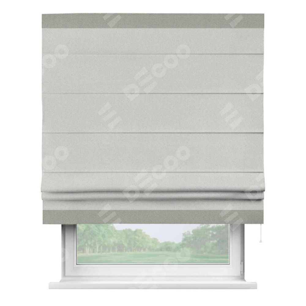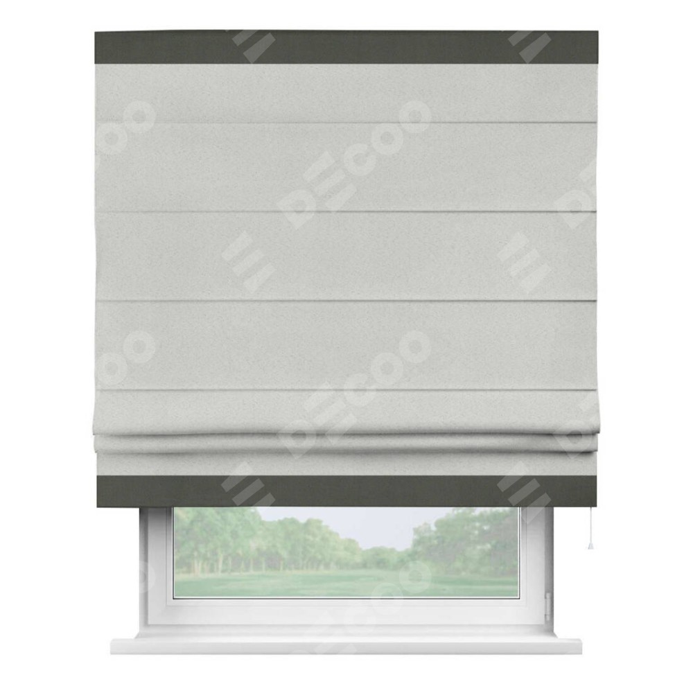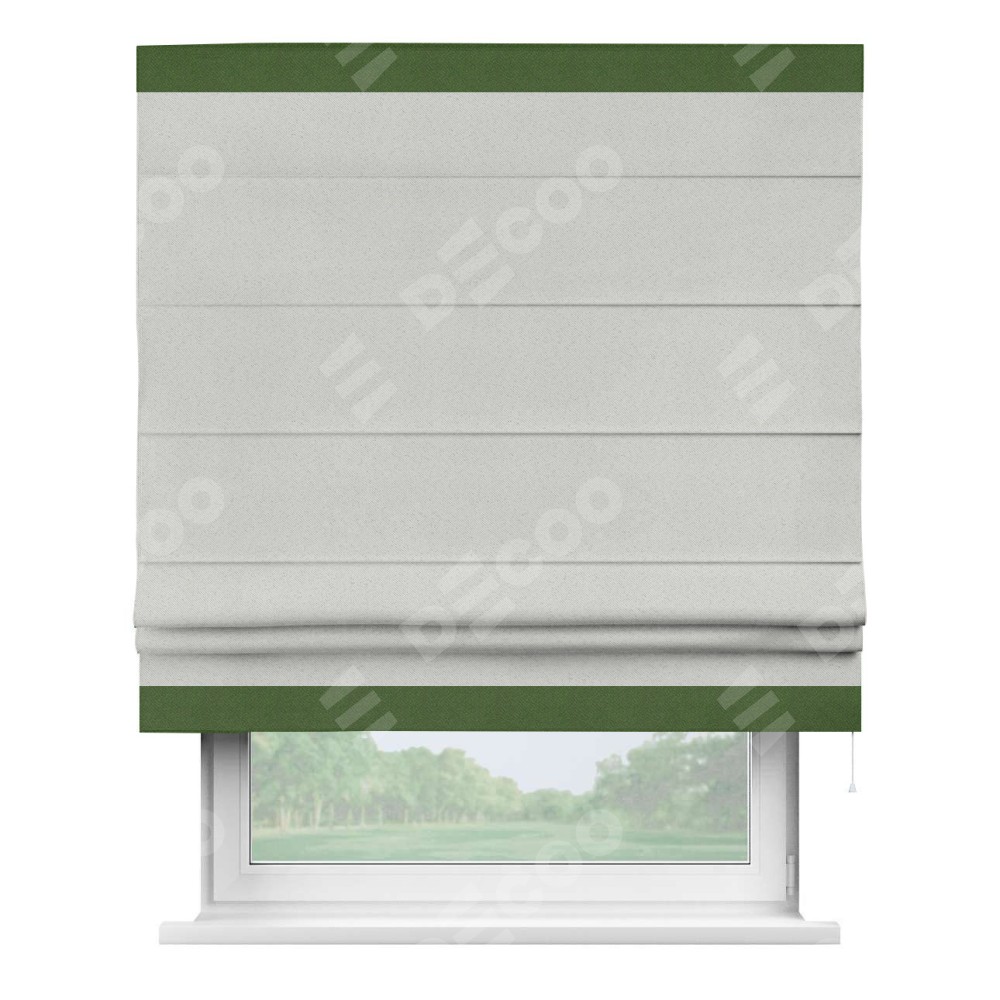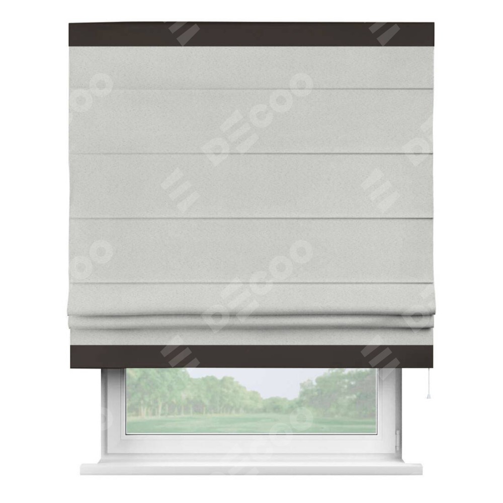 Римская штора пошита из ткани однотонный блэкаут милк, артикул: 23, с отделкой кантом «Горизонт» предлагает уникальное дизайнерское решение, при котором кант располагается только вверху и снизу шторы. Такое решение делает акцент на горизонтальных линиях, визуально расширяя пространство и придавая окну более строгий и организованный вид. Отделка кантом в этих ключевых местах не только украшает штору, но и способствует её долговечности, защищая наиболее уязвимые к износу края.