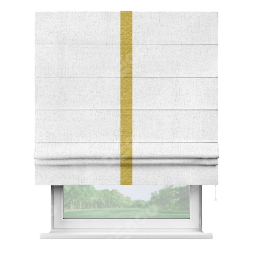 Римская штора пошита из ткани лён белоснежный, артикул: 95632, с отделкой кантом «Хайвэй» представляет собой уникальное и смелое дизайнерское решение, где кант расположен вертикально посередине шторы. Этот дизайн не только выделяет штору среди других вариантов оформления окон, но и создает интересный визуальный акцент, привлекая внимание к центру окна и разделяя штору на визуальные зоны. Такой нестандартный подход добавляет динамичности интерьеру и может быть использован для подчеркивания особенностей оформления помещения.