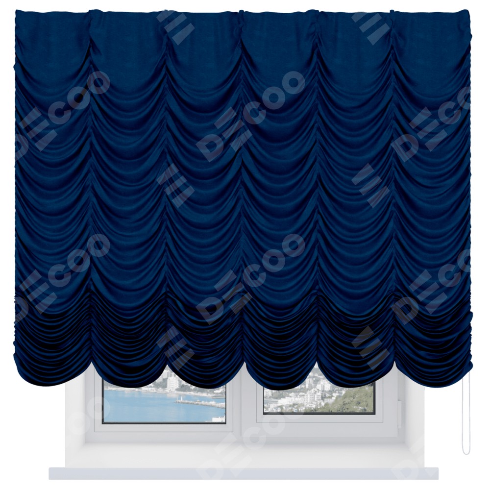 Французская штора производителя «Cortin», используется для проёма, пошита из ткани софт однотонный синий, артикул ткани 42937. Имеет универсальный механизм и подходит для монтажа: на потолок и на стену.