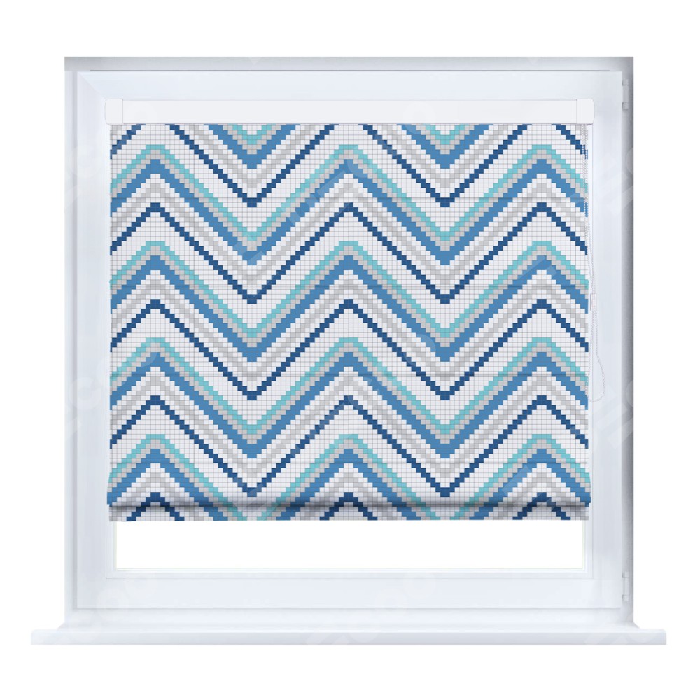 Римская штора производителя «Cortin», устанавливается на створку окна, пошита из ткани блэкаут с нанесением сублимационной печати «Геометрическая волна». Штора шьётся по индивидуальным размерам, для данного типа римской шторы возможная ширина от 35 до 150 см., высота до 250 см.